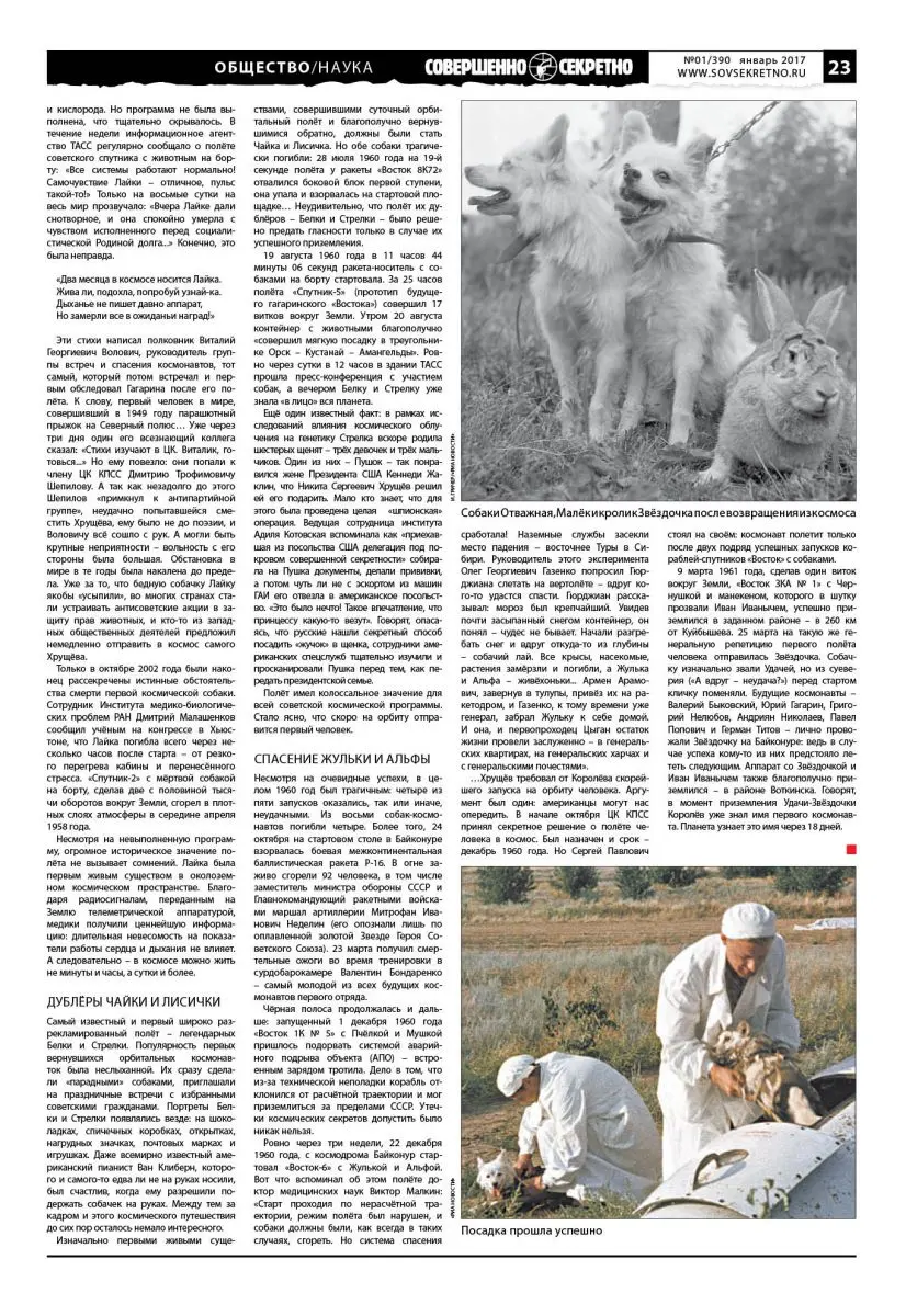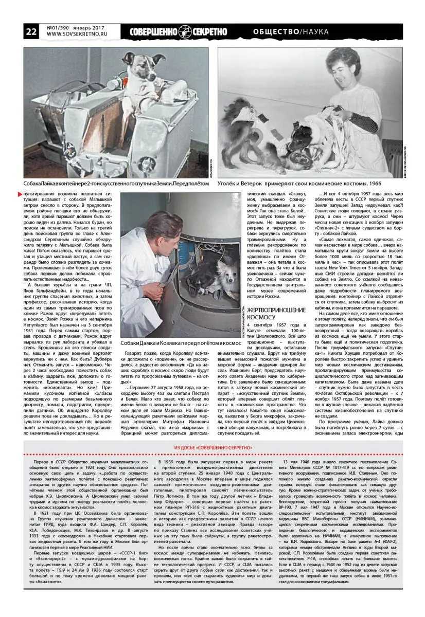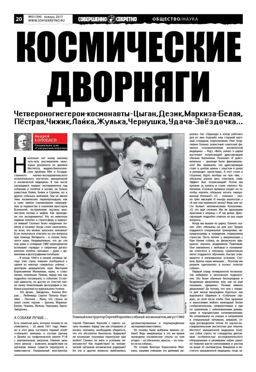 Несколько лет назад наконец чуть-чуть рассекретили некоторые документы из архивов Института медико-биологических проблем РАН и Государственного научно-исследовательского испытательного института авиационной и космической медицины. В том числе касающиеся первых экспериментов над собаками и полётов в космос не только известных Лайки, Белки и Стрелки, но и других собачьих экипажей. Тем не менее тема космических первопроходцев, как и само тайное соревнование сверхдержав за первенство в освоении просторов Вселенной, по-прежнему окутаны множеством легенд и мифов. Как проходили эти эксперименты? Кто из животных первым полетел в стратосферу и вернулся живым? Сколько было неудачных полётов и почему? Когда стало окончательно ясно, что можно запускать человека? Если попытаться ответить на эти вопросы при помощи Интернета – в голове получится каша. Неудивительно, что до сих пор даже в солидных СМИ периодически всплывает «правда» о секретных догагаринских полётах человека – даже с фамилиями и фотографиями погибших.
