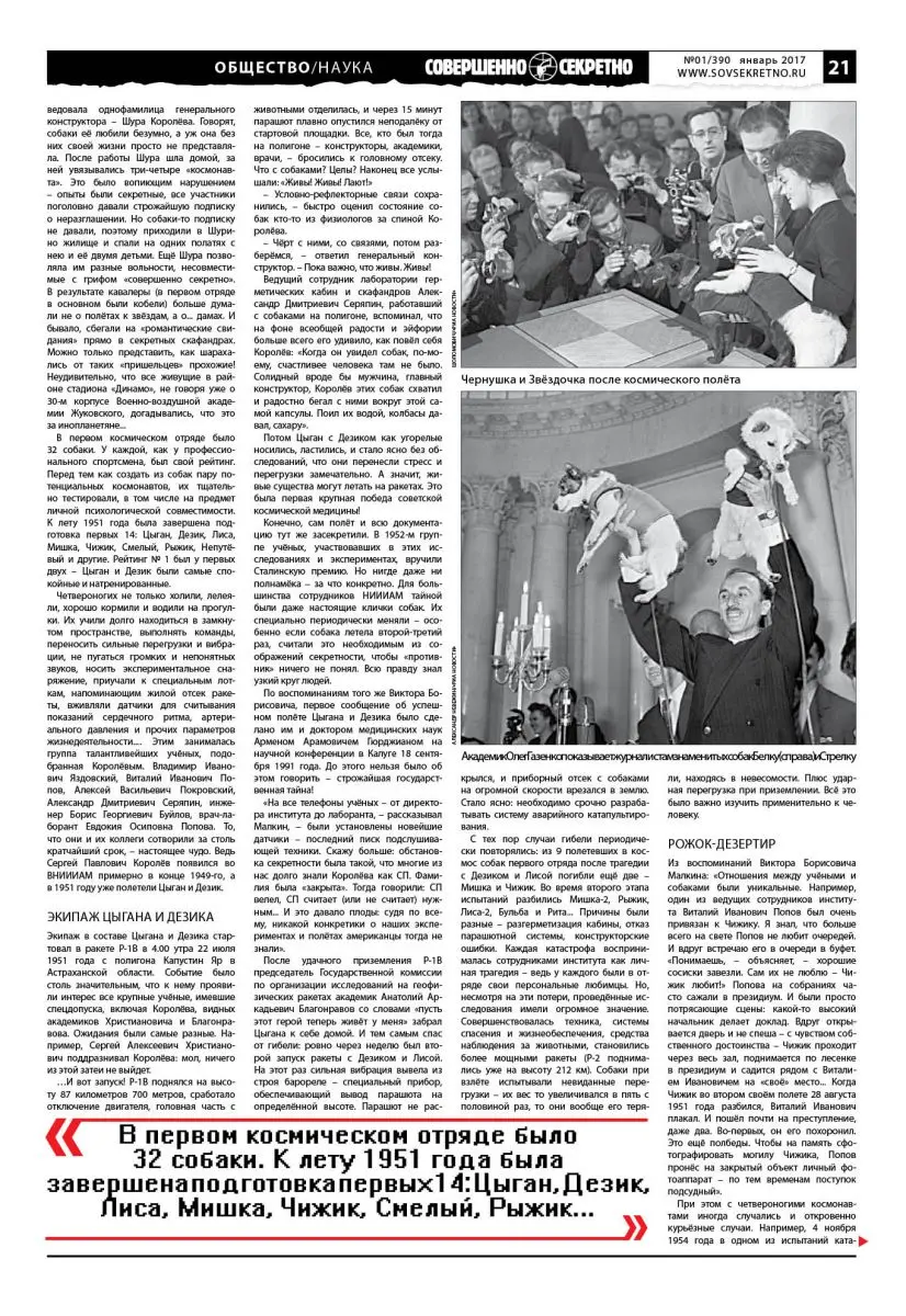 Конечно, сам полёт и всю документацию тут же засекретили. В 1952-м группе учёных, участвовавших в этих исследованиях и экспериментах, вручили Сталинскую премию. Но нигде даже ни полнамёка – за что конкретно. Для большинства сотрудников НИИИАМ тайной были даже настоящие клички собак. Их специально периодически меняли – особенно если собака летела второй-третий раз, считали это необходимым из соображений секретности, чтобы «противник» ничего не понял. Всю правду знал узкий круг людей.