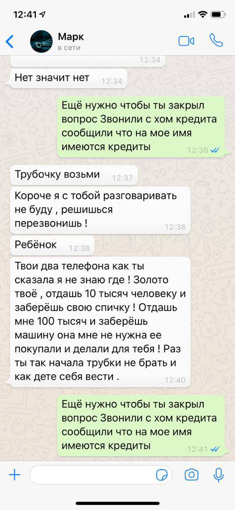 Через какое-то время у Марка «кредитный» телефон сломался, и, конечно, ему потребовался новый – тоже в кредит… «Мы взяли ему в кредит на моё имя ещё один телефон, уже на сумму 72 000 рублей. Он также открыл на меня дебетовую карту лимитом 15 000 рублей. Параллельно с этим, Марк познакомил меня со своей семьей. Его мама восторженно хвалила меня и говорила: «Его бывшая девушка мне не нравилась, а ты просто чудо! Именно то, что нужно нашему сыну!». Папа Марка – Игорь тоже со мной общался на одной волне, пытался раскрутить меня на то, чтобы моя мама продала бизнес и вложила в его… Я счастлива, что мама отказалась, но всё же тоже пострадала от действий Марка, она перевела ему 6 400 рублей на ремонт машины, но ремонт по настоящее время не был сделан».