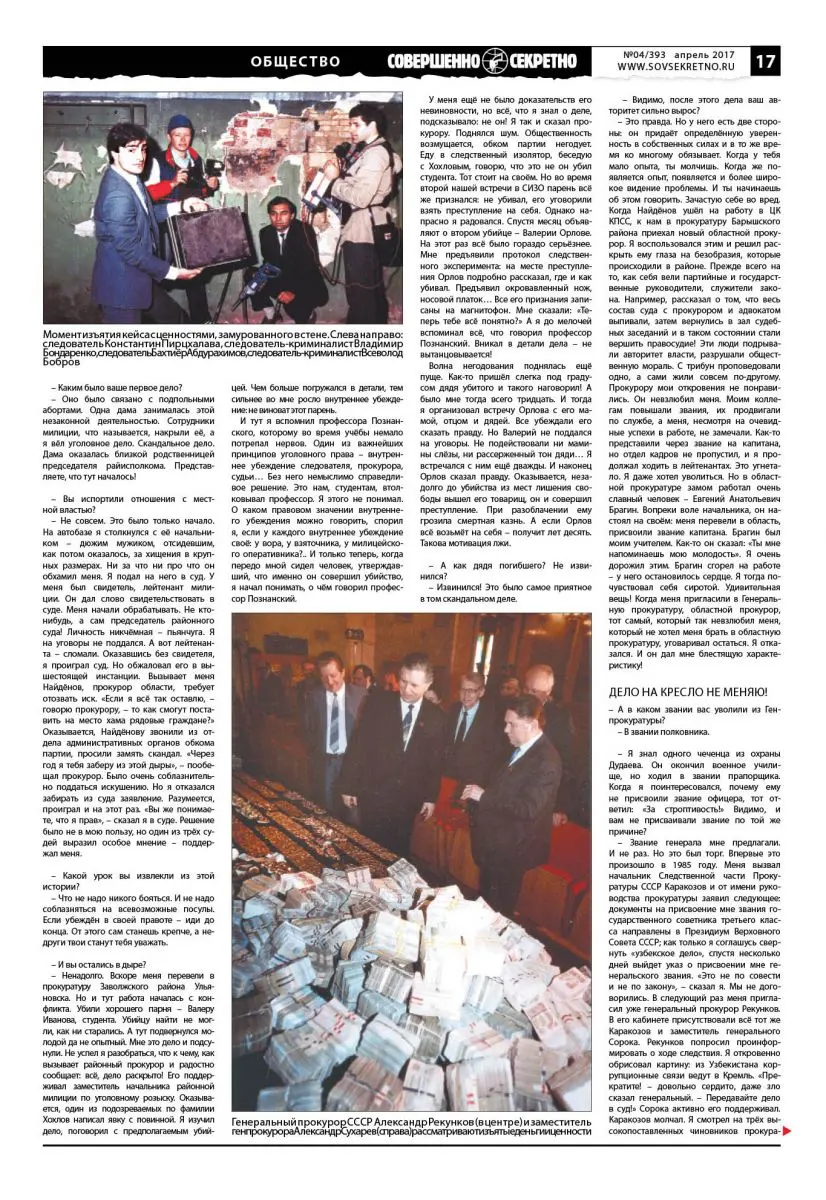– Звание генерала мне предлагали. И не раз. Но это был торг. Впервые это произошло в 1985 году. Меня вызвал начальник Следственной части Прокуратуры СССР Каракозов и от имени руководства прокуратуры заявил следующее: документы на присвоение мне звания государственного советника третьего класса направлены в Президиум Верховного Совета СССР; как только я соглашусь свернуть «узбекское дело», спустя несколько дней выйдет указ о присвоении мне генеральского звания. «Это не по совести и не по закону», – сказал я. Мы не договорились. В следующий раз меня пригласил уже генеральный прокурор Рекунков. В его кабинете присутствовали всё тот же Каракозов и заместитель генерального Сорока. Рекунков попросил проинформировать о ходе следствия. Я откровенно обрисовал картину: из Узбекистана коррупционные связи ведут в Кремль. «Прекратите! – довольно сердито, даже зло сказал генеральный. – Передавайте дело в суд!» Сорока активно его поддерживал. Каракозов молчал. Я смотрел на трёх высокопоставленных чиновников прокуратуры и ощущал огромную разницу между ними и собой. Они были в страхе и панике. Им приказывали, и они боялись ослушаться. Они готовы были преступить закон, лишь бы остаться на своих должностях. Я же был внутренне свободен! Я не держался за свою должность. И правда, и закон были на моей стороне.