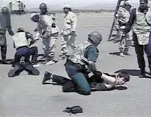 Виноградову придавило руку канатом, перерезало сухожилия. Одной рукой он держался за форточку, другой старался удержаться на канате. Но раненая рука сорвалась, и он с трёхметровой высоты свалился на бетон. В салоне тем временем уже работали три группы саудовского спецназа. Операция была разработана, в общем-то, толково, хотя и не без накладок. У одной группы имелись пистолеты, заряженные холостыми патронами, у второй – резиновыми пулями и у третьей, которая и пошла на штурм, – боевыми патронами. А вокруг самолёта кольцом стояли спецназовцы с автоматами. Они уже вскарабкались на крылья и выбивали аварийные люки внутрь самолёта, тогда как их нужно было просто выкинуть наружу.