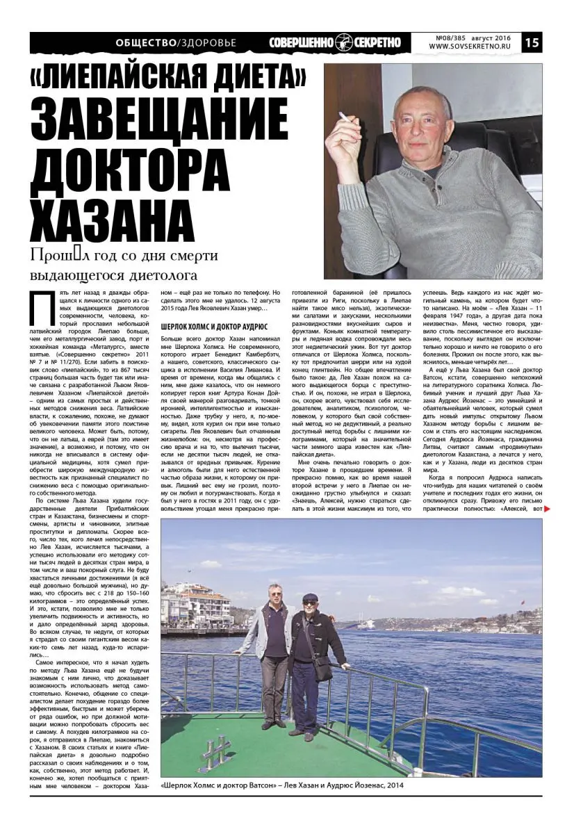 Больше всего доктор Хазан напоминал мне Шерлока Холмса. Не современного, которого играет Бенедикт Камбербэтч, а нашего, советского, классического сыщика в исполнении Василия Ливанова. И время от времени, когда мы общались с ним, мне даже казалось, что он немного копирует героя книг Артура Конан Дойля своей манерой разговаривать, тонкой иронией, интеллигентностью и изысканностью. Даже трубку у него, я, по-моему, видел, хотя курил он при мне только сигареты. Лев Яковлевич был отчаянным жизнелюбом: он, несмотря на профессию врача и на то, что вылечил тысячи, если не десятки тысяч людей, не отказывался от вредных привычек. Курение и алкоголь были для него естественной частью образа жизни, к которому он привык. Лишний вес ему не грозил, поэтому он любил и погурманствовать. Когда я был у него в гостях в 2011 году, он с удовольствием угощал меня прекрасно приготовленной бараниной (её пришлось привезти из Риги, поскольку в Лиепае найти такое мясо нельзя), экзотическими салатами и закусками, несколькими разновидностями вкуснейших сыров и фруктами. Коньяк комнатной температуры и ледяная водка сопровождали весь этот недиетический ужин. Вот тут доктор отличался от Шерлока Холмса, поскольку тот предпочитал шерри или на худой конец глинтвейн. Но общее впечатление было такое: да, Лев Хазан похож на самого выдающегося борца с преступностью. И он, похоже, не играл в Шерлока, он, скорее всего, чувствовал себя исследователем, аналитиком, психологом, человеком, у которого был свой собственный метод, но не дедуктивный, а реально доступный метод борьбы с лишними килограммами, который на значительной части земного шара известен как «Лиепайская диета».