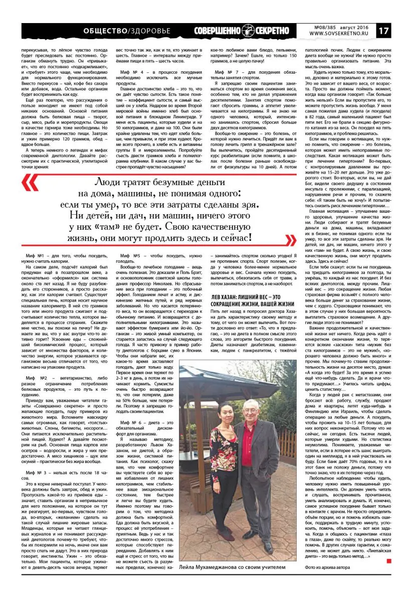 Пять лет назад я дважды обращался к личности одного из самых выдающихся диетологов современности, человека, который прославил небольшой латвийский городок Лиепаю больше, чем его металлургический завод, порт и хоккейная команда «Металургс», вместе взятые. («Совершенно секретно» 2011 № 7 и № 11/270). Если забить в поисковик слово «лиепайский», то из 867 тысяч страниц большая часть будет так или иначе связана с разработанной Львом Яковлевичем Хазаном «Лиепайской диетой» – одним из самых простых и действенных методов снижения веса. Латвийские власти, к сожалению, похоже, не думают об увековечении памяти этого поистине великого человека. Может быть, потому, что он не латыш, а еврей (там это имеет значение), а возможно, и потому, что он никогда не вписывался в систему официальной медицины, хотя сумел приобрести широкую международную известность как признанный специалист по снижению веса с помощью оригинального собственного метода.