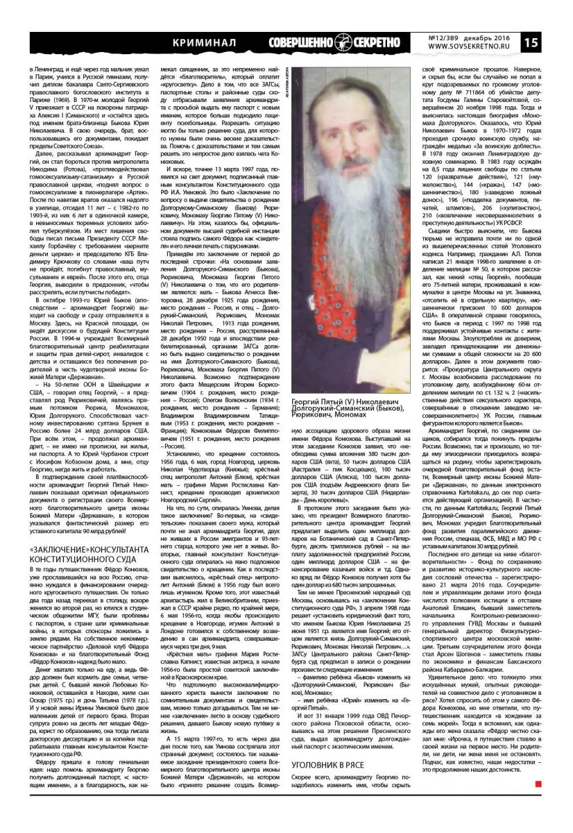 Ещё показал письмо на бланке Всемирного благотворительного центра реабилитации и защиты прав детей-сирот, адресованное директору департамента консульской службы МИД РФ, в котором «в связи с подготовкой круиза в честь 300-летия Российского Флота, оформлением инвестиций из султаната Бруней в российскую экономику в размере 24 млрд долларов США и формированием Всероссийской библиотеки мировой литературы», была просьба выдать служебный заграничный паспорт «президенту Всемирного центра Долгорукому-Симанскому (Быкову) Рюриковичу, Мономаху Георгию V Николаевичу».