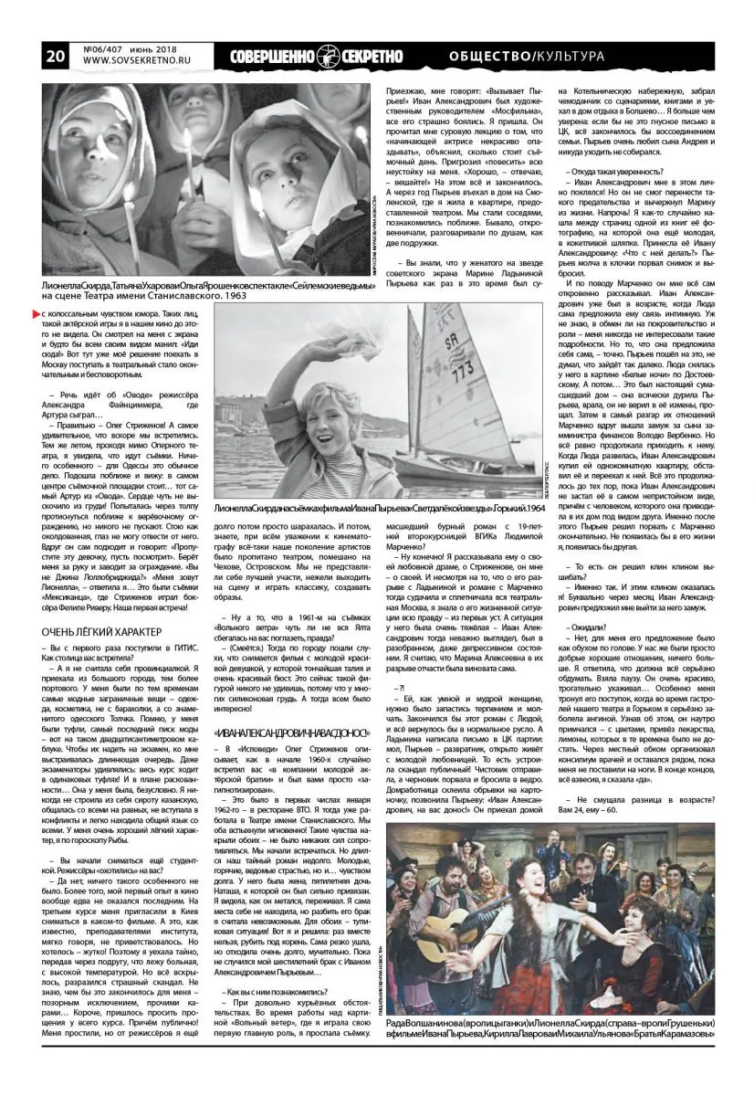 – Последние годы на Ивана Александровича наговаривают невесть что: и такой, и сякой, и «невоздержанный хам, одиозная личность», и «играючи ломал актёрские судьбы», «несогласных стирал в порошок»… Поверьте, это всё легенды! Я снималась у него в двух картинах и могу сказать, что более тихого, нежного и деликатного режиссёра я в своей жизни не встречала. Ко всем актёрам он относился как к божествам! А все так называемые жертвы Пырьева… Если разобраться хорошенько, честно, положа руку на сердце, то они сами виноваты в своей изломанной судьбе.