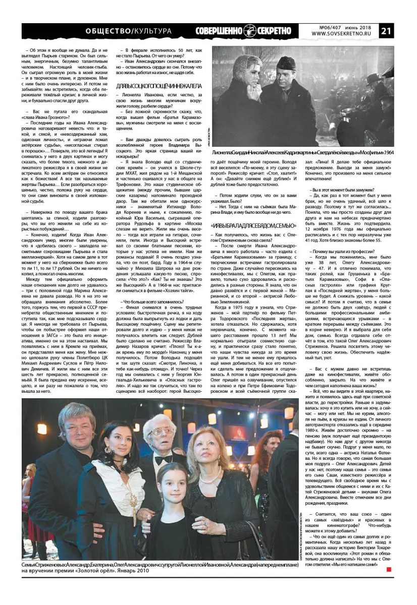 А разве не удивительно, что Лионелле Ивановне довелось быть женой двух необыкновенных мужчин: сначала легендарного режиссёра, шестикратного лауреата Сталинской премии Ивана Александровича Пырьева, а затем – одного из самых знаменитых красавцев и талантов того времени – актёра Олега Стриженова?! Причём оба выбрали её из бессчётного множества кандидаток, делали официальное предложение руки и сердца, долго уговаривали, с трепетом ждали «приговора». Понимали: эта женщина не годится для лёгкой любовной интрижки, она рождена быть музой, надёжным семейным тылом и подругой всей жизни – не меньше!