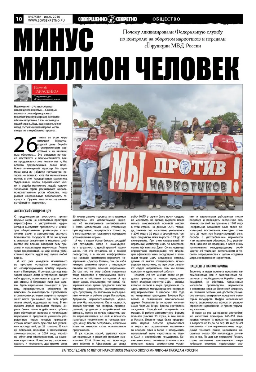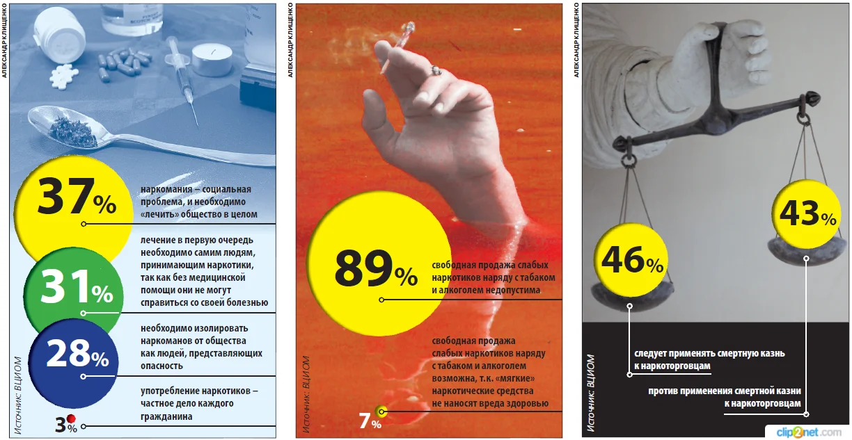 Отмечено существенное увеличение количества граждан, совершивших преступления в состоянии наркотического опьянения. За пять лет их число увеличилось в 2,6 раза: с 9,5 до 24,3 тысячи человек. Много это или мало? За последние 10 лет от наркотиков умерло около миллиона молодых граждан России. Наркотики стали причиной 70 процентов смертей россиян в возрасте от 15 до 34 лет. Для сравнения, это в 20 раз выше аналогичных показателей в Японии. В 2009 году Россия заняла первое место в мире по употреблению героина – таковы официальные данные Управления ООН по наркотикам и преступности. По подсчётам некоторых зарубежных экспертов, в нашей стране оседает от 75 до 80 тонн героина – самого опасного и безжалостного убийцы. Это в 3,5 раза больше, чем в США и Канаде, вместе взятых, и в два раза больше, чем в Китае.