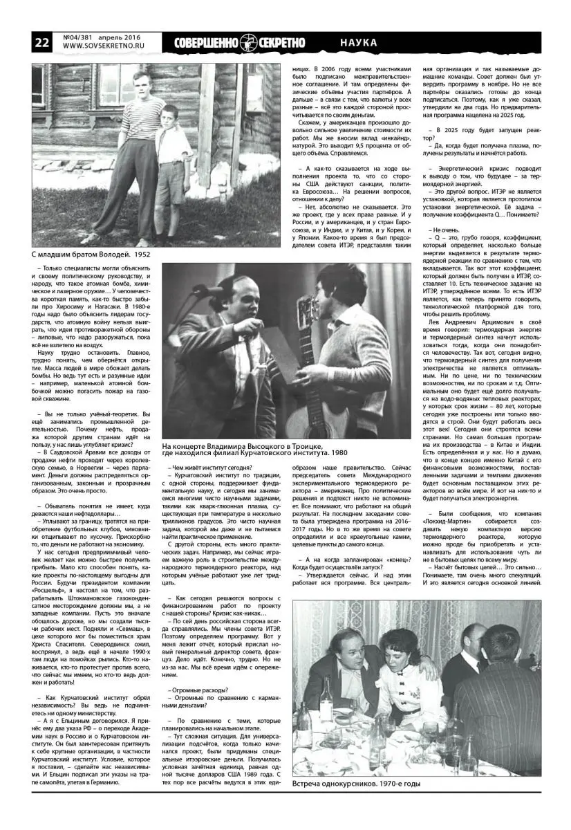 В 2006 году – десять лет назад – Россия, США, Китай, Индия, Япония и Южная Корея подписали соглашение о начале работ по строительству на юге Франции Международного экспериментального термоядерного реактора (International Thermonuclear Experimental Reactor, ITER/ИТЭР). Этому событию предшествовали два десятилетия инженерно-технических, конструкторских, научных работ, в которых участвовали тысячи самых высоколобых учёных мира. Руководил же всей этой работой на протяжении тридцати минувших лет наш человек – академик Велихов. В науке Евгений Павлович долгожитель. В главном атомном исследовательском центре страны – в Институте Курчатова – он работает 55 лет. Одновременно возглавляет кафедру плазменной энергетики в МФТИ. Участвует в работе Российского Пагуошского комитета при Президиуме РАН. С 1975 года возглавляет отечественную программу разработки управляемых термоядерных реакторов. Именно Велихову принадлежит авторство инициативы, с которой СССР в 1985 году обратился к странам, наиболее продвинувшимся в изучении термоядерных реакций, создать совместными усилиями реактор нового поколения. Чисто в научных целях. В начале этого февраля, в свой 81-й день рождения, Евгений Павлович Велихов ответил на вопросы обозревателя «Совершенно секретно».