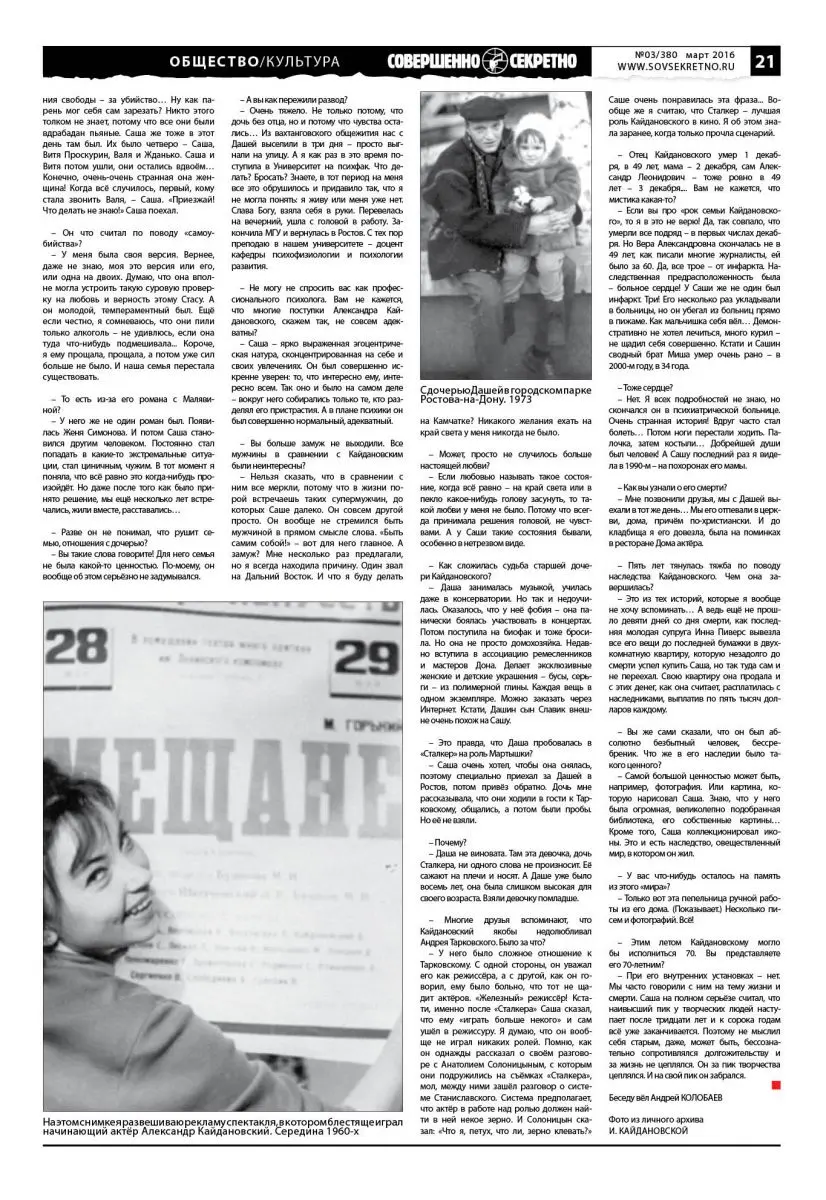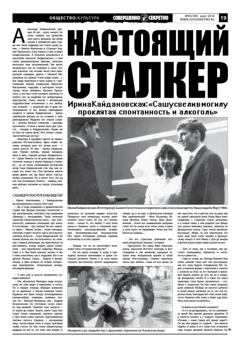 – У него было сложное отношение к Тарковскому. С одной стороны, он уважал его как режиссёра, а с другой, как он говорил, ему было больно, что тот не щадит актёров. «Железный» режиссёр! Кстати, именно после «Сталкера» Саша сказал, что ему «играть больше некого» и сам ушёл в режиссуру. Я думаю, что он вообще не играл никаких ролей. Помню, как он однажды рассказал о своём разговоре с Анатолием Солоницыным, с которым они подружились на съёмках «Сталкера», мол, между ними зашёл разговор о системе Станиславского. Система предполагает, что актёр в работе над ролью должен найти в ней некое зерно. И Солоницын сказал: «Что я, петух, что ли, зерно клевать?» Саше очень понравилась эта фраза… Вообще же я считаю, что Сталкер – лучшая роль Кайдановского в кино. Я об этом знала заранее, когда только прочла сценарий
