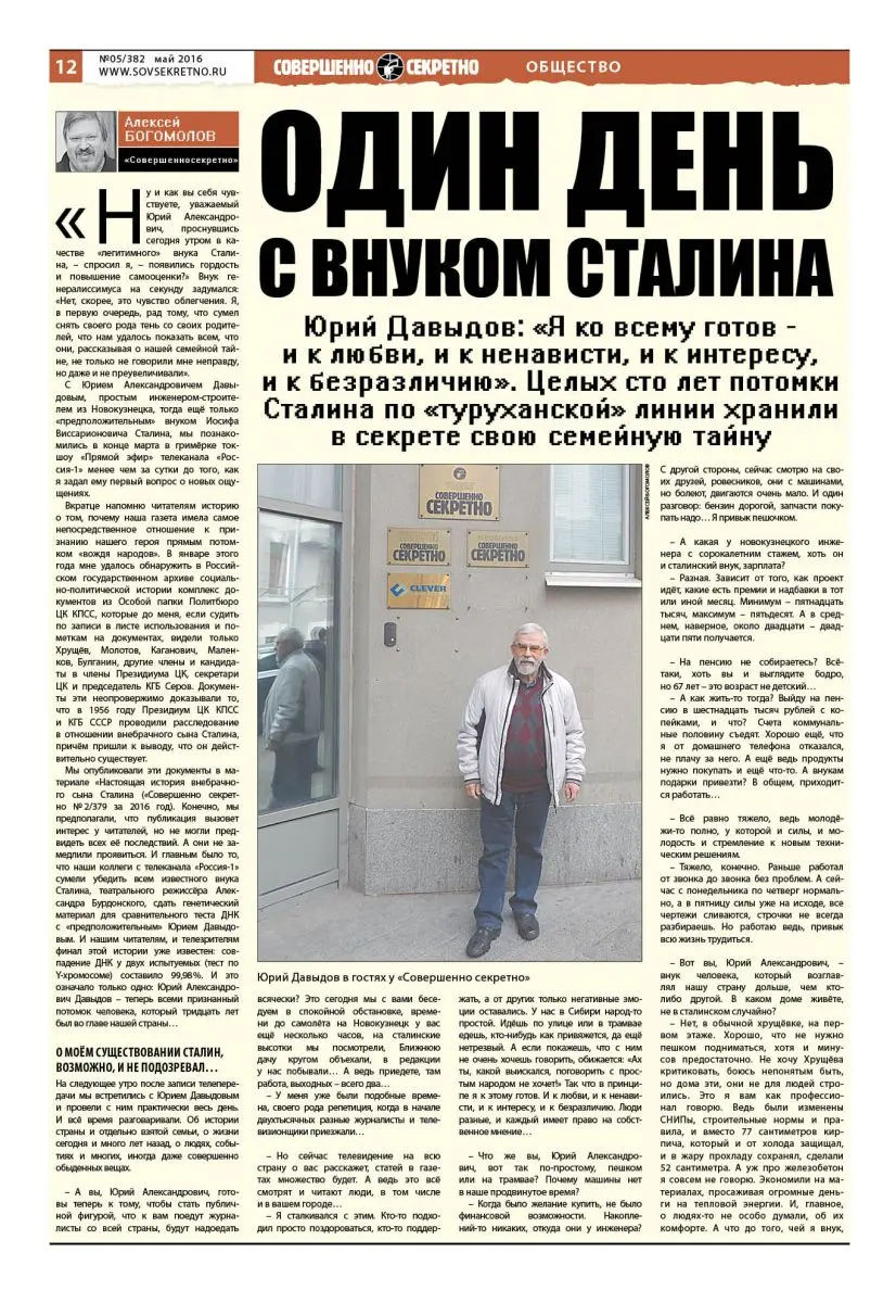 Мы опубликовали эти документы в материале «Настоящая история внебрачного сына Сталина («Совершенно секретно № 2/379 за 2016 год). Конечно, мы предполагали, что публикация вызовет интерес у читателей, но не могли предвидеть всех её последствий. А они не замедлили проявиться. И главным было то, что наши коллеги с телеканала «Россия-1» сумели убедить всем известного внука Сталина, театрального режиссёра Александра Бурдонского, сдать генетический материал для сравнительного теста ДНК с «предположительным» Юрием Давыдовым. И нашим читателям, и телезрителям финал этой истории уже известен: совпадение ДНК у двух испытуемых (тест по Y-хромосоме) составило 99,98 %. И это означало только одно: Юрий Александрович Давыдов – теперь всеми признанный потомок человека, который тридцать лет был во главе нашей страны…