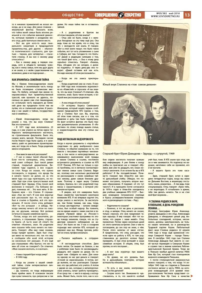 Мы ещё долго разговаривали с Юрием Александровичем Давыдовым о необычной истории его семьи, и самое главное, что мне запало в душу, – это необычная для родственников известных персон простота и искренность. Его отец, сын Сталина, прожил всю жизнь как обычный гражданин нашей страны, жил, работал, воевал, был награждён полутора десятками орденов и медалей, переезжал с места на место, воспитывал детей и внуков. Да и сам Юрий Давыдов может в каком-то смысле служить примером честного и не испорченного ни «оттепелью», ни «застоем», ни перестройкой, ни «лихими девяностыми» отношения к нашей жизни. 22 апреля, за несколько дней до сдачи номера в печать, Юрию Александровичу исполнилось 68 лет. Мы поздравляем его с этим событием и надеемся, что наши читатели присоединятся к нам…