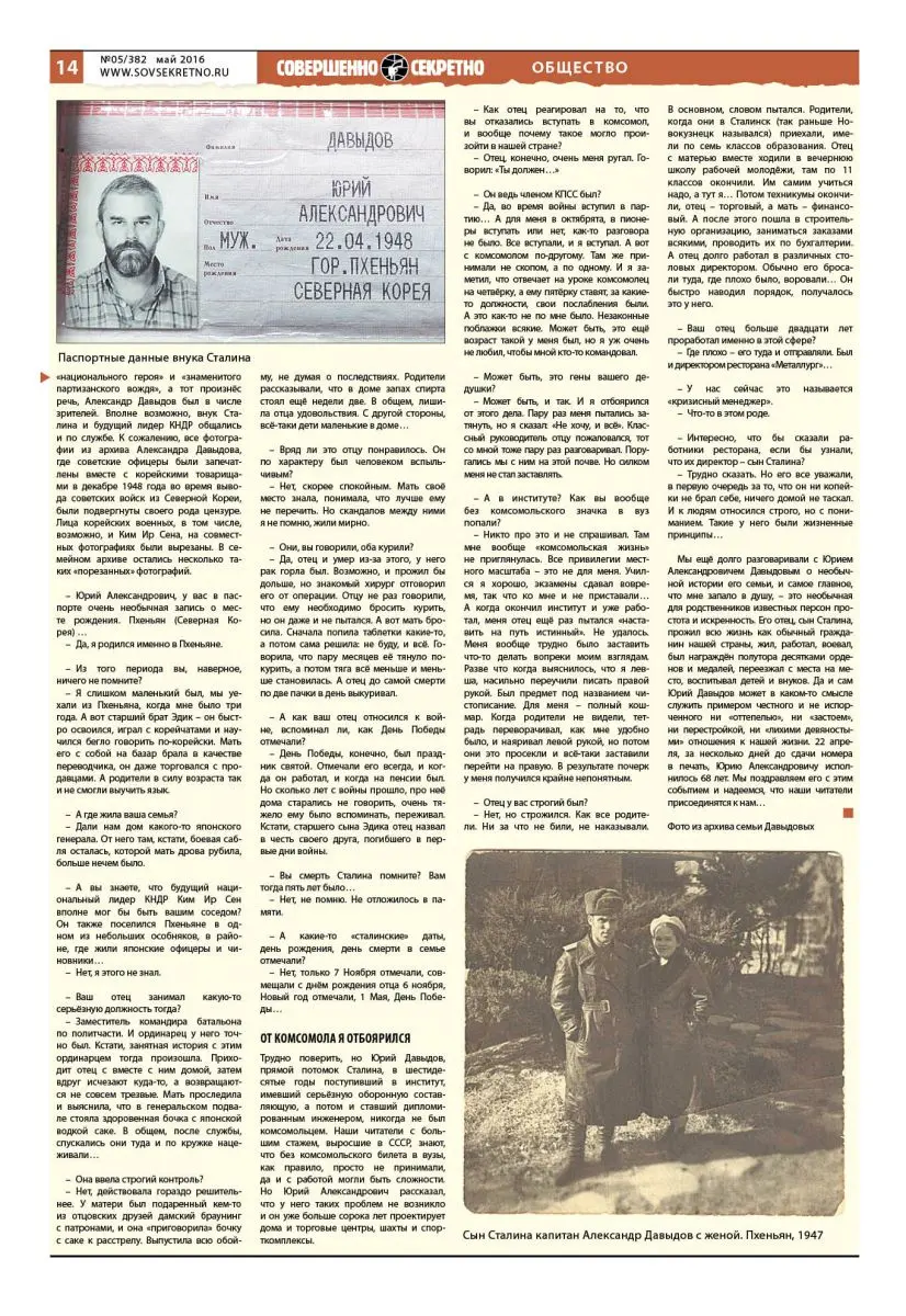 Исследуя биографию Юрия Александровича Давыдова и его отца, Александра Давыдова, я обнаружил целый ряд любопытных совпадений, которые, несомненно, должны заинтересовать не только наших читателей, но и руководство Трудовой партии Кореи. Любопытный факт: внук Сталина родился 22 апреля 1948 года в тогда ещё временной столице Северной Кореи – городе Пхеньяне. В сентябре 1945 года сын Сталина Александр Давыдов был вместе со своей частью переведён в Северную Корею и служил там в звании капитана Рабоче-крестьянской Красной Армии. Тогда же в Пхеньян прибыл другой капитан РККА Ким Ир Сен, который стал помощником военного коменданта Пхеньяна.