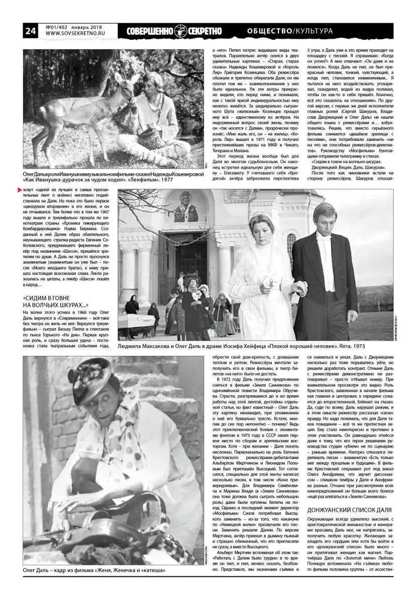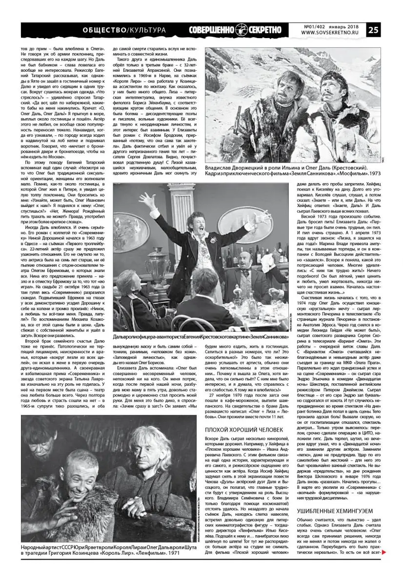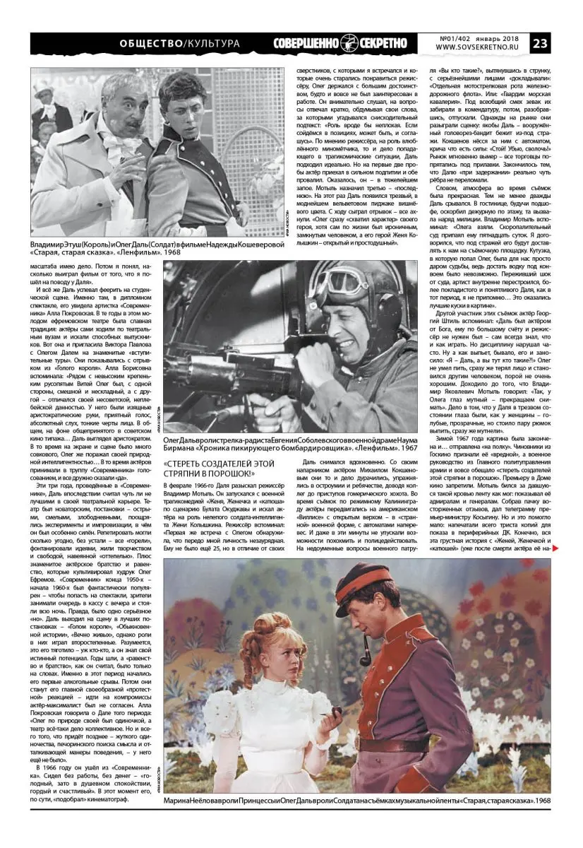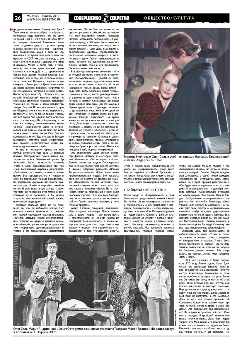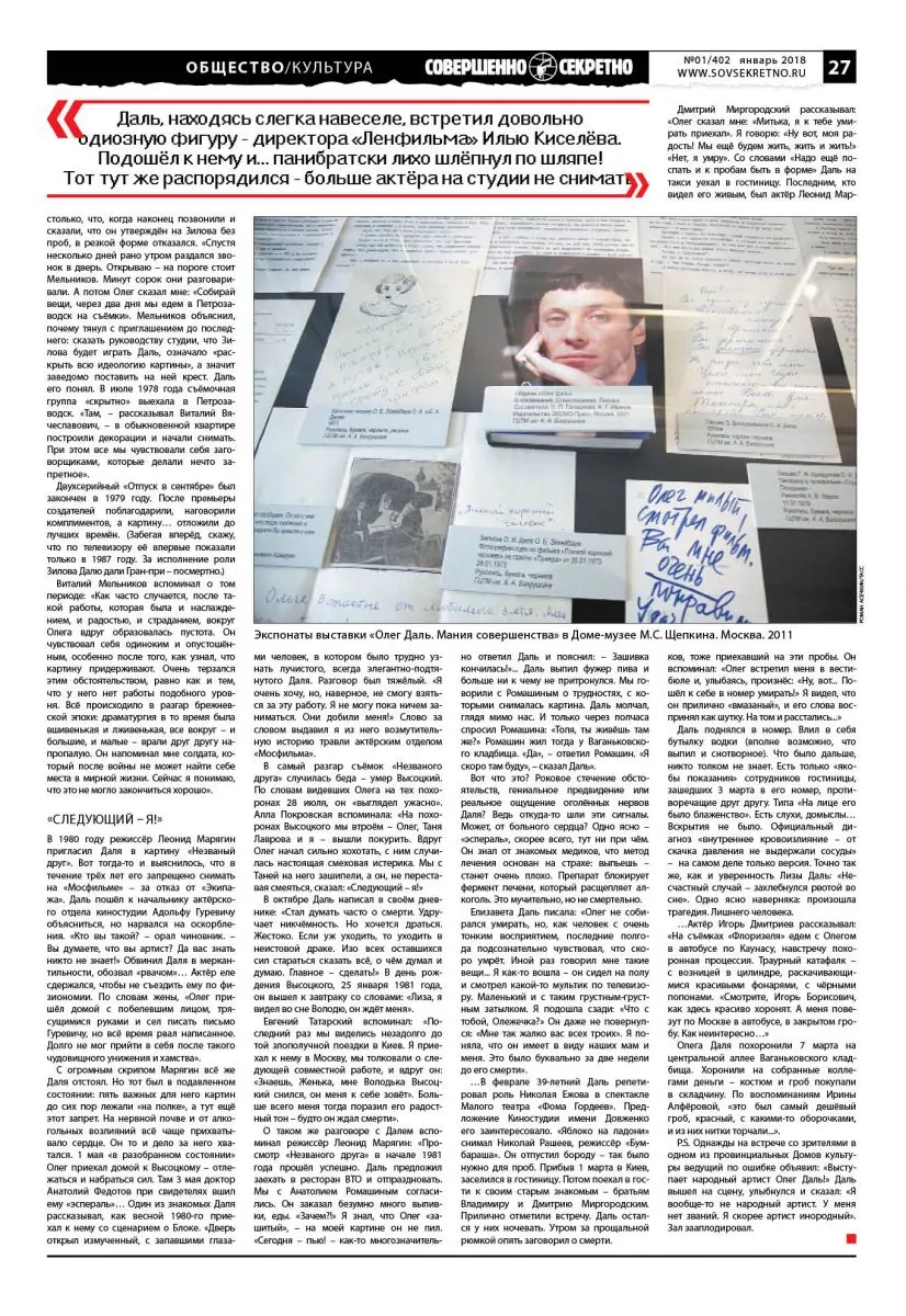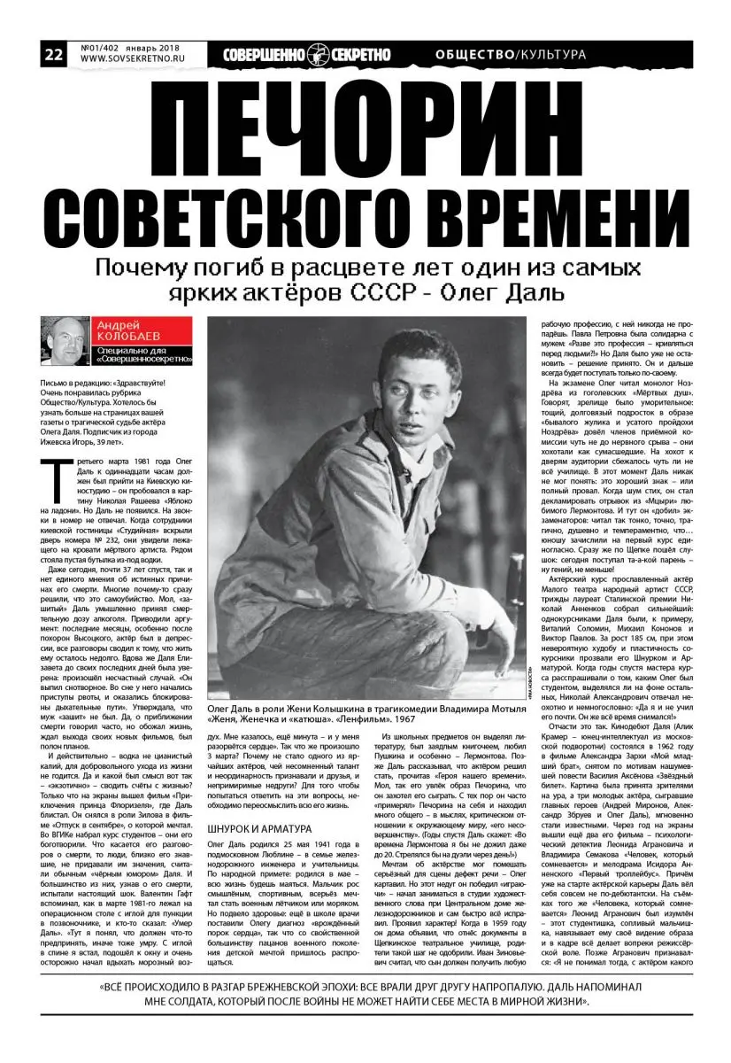 Письмо в редакцию: «Здравствуйте! Очень понравилась рубрика Общество/Культура. Хотелось бы узнать больше на страницах вашей газеты о трагической судьбе актёра Олега Даля. Подписчик из города Ижевска Игорь, 39 лет».