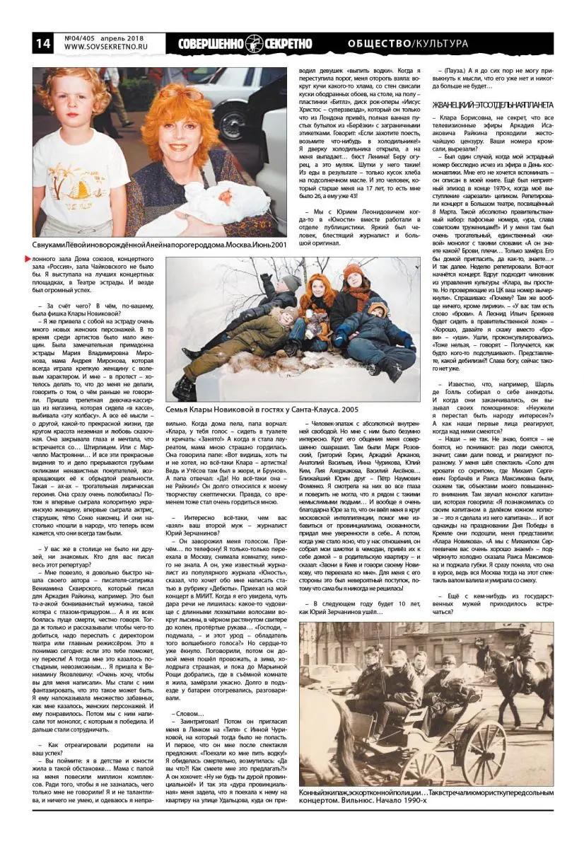 – Наши – не так. Не знаю, боятся – не боятся, но понимают: раз люди смеются, значит, сами дали повод, и реагируют по-разному. У меня шёл спектакль «Соло для кровати со скрипом», где Михаил Сергеевич Горбачёв и Раиса Максимовна были, скажем так, объектами моего повышенного внимания. Там звучал монолог капитанши, которая говорила: «Я познакомилась со своим капитаном в далёком южном колхозе – это я сделала из него капитана»… И вот однажды на праздновании Дня Победы в Кремле они подошли, меня представили: «Клара Новикова». «А мы с Михаилом Сергеевичем вас очень хорошо знаем!» – подчёркнуто холодно сказала Раиса Максимовна и поджала губки. Я сразу поняла, что она в курсе, ведь вся Москва тогда на этот спектакль валом валила и умирала со смеху.