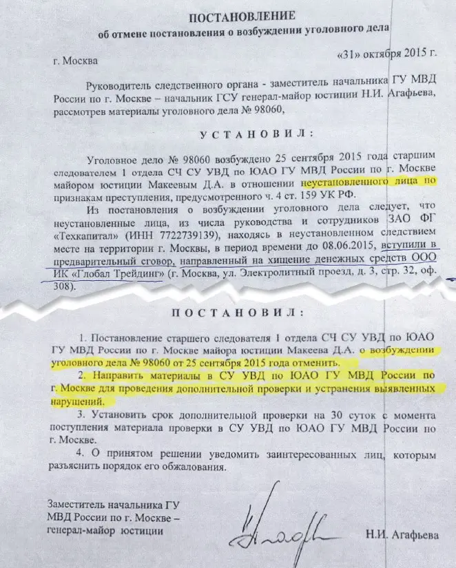 В ходе доследственной проверки было установлено: «Во исполнении преступного умысла неустановленные лица из числа руководства ЗАО ФГ «Техкапитал» заключили с ООО ИК «Глобал Трейдинг» договор купли-продажи №0806/2015 от 08.06.2015 и договор купли-продажи №1006/2015 от 10.06.2015, в соответствии с условиями которых ЗАО ФГ «Техкапитал» обязалось приобрести 3025 именных документарных еврооблигаций ПАО «Сбербанк России», при этом не намереваясь исполнить обязательства…