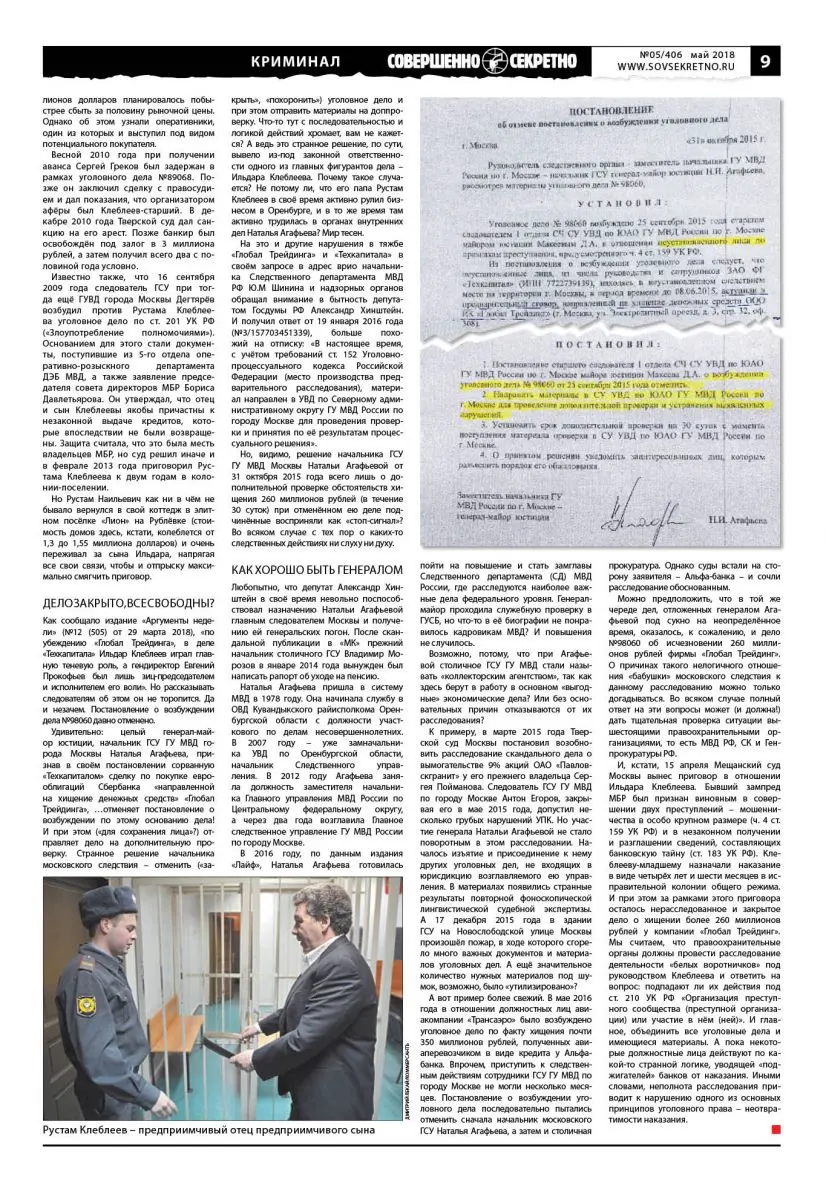 Удивительно: целый генерал-майор юстиции, начальник ГСУ ГУ МВД города Москвы Наталья Агафьева, признав в своём постановлении сорванную «Техкапиталом» сделку по покупке еврооблигаций Сбербанка «направленной на хищение денежных средств» «Глобал Трейдинга», …отменяет постановление о возбуждении по этому основанию дела! И при этом («для сохранения лица»?) отправляет дело на дополнительную проверку. Странное решение начальника московского следствия – отменить («закрыть», «похоронить») уголовное дело и при этом отправить материалы на доппроверку. Что-то тут с последовательностью и логикой действий хромает, вам не кажется? А ведь это странное решение, по сути, вывело из-под законной ответственности одного из главных фигурантов дела – Ильдара Клеблеева. Почему такое случается? Не потому ли, что его папа Рустам Клеблеев в своё время активно рулил бизнесом в Оренбурге, и в то же время там активно трудилась в органах внутренних дел Наталья Агафьева? Мир тесен.