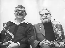 Аркадий Стругацкий и Александр Казанцев после получения литературной премии «Аэлита», 1981 год. Премия была учреждена журналом «Уральский следопыт» совместно с Советом по приключенческой и научно-фантастической литературе Союза писателей РСФСР за лучшее произведение отечественной фантастики. Стругацкие получили премию за «Жука в муравейнике», а Казанцев – за общий вклад в литературу и в развитие жанра |