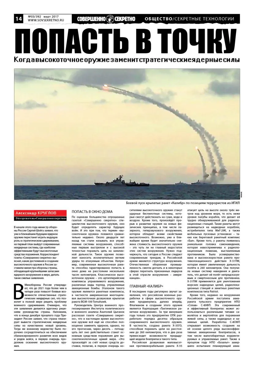 В начале этого года министр обороны России Сергей Шойгу заявил, что уже в ближайшем будущем ядерное оружие перестанет играть ведущую роль в стратегическом сдерживании, на первый план выйдут современные неядерные системы, где наиболее эффективными будут высокоточные средства поражения. Корреспондент газеты «Совершенно секретно» выяснил, какие достижения в создании высокоточного оружия в России заставили министра обороны страны, обладающей крупнейшими запасами ядерного вооружения в мире, делать такие смелые заявления.