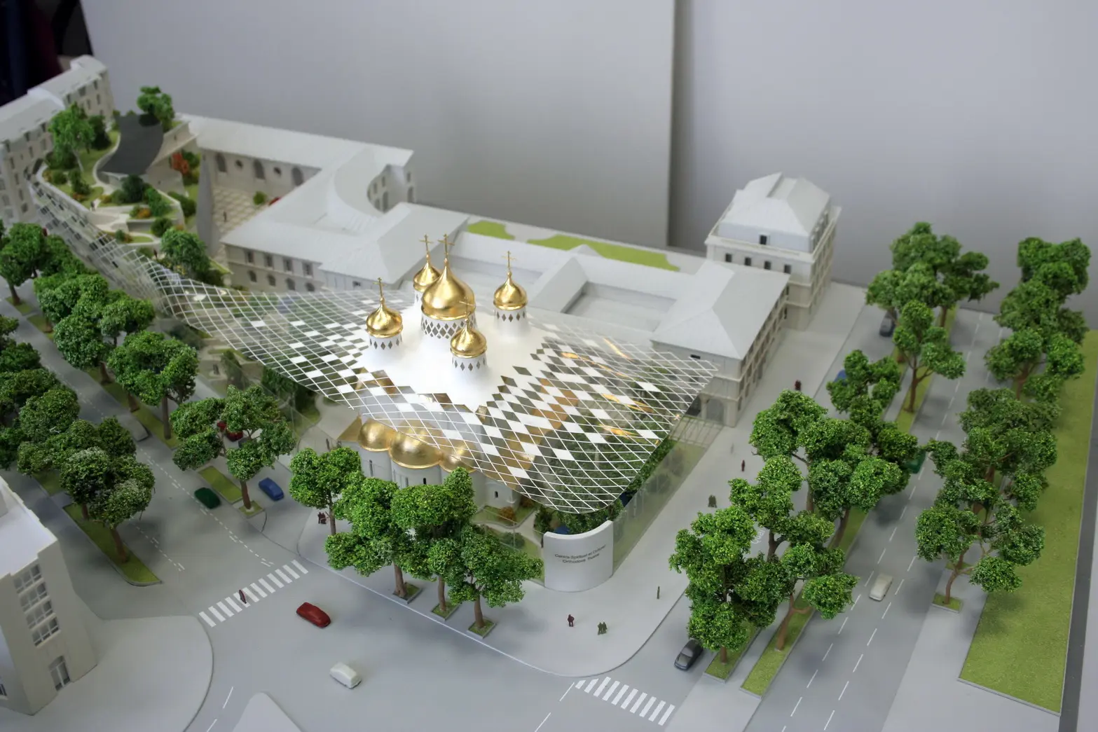 Наш проект храма был очень элегантным. И представители обоих государств и православной церкви согласились с нашей концепцией: «Есть сад, в саду храм, накрытый прозрачным покровом, который в свою очередь объединяет храм с культурным центром». Этот прозрачный покров давал бы возможность людям собираться вокруг храма и в непогоду, под ним можно было бы устраивать выставки, проводить концерты на открытом воздухе.