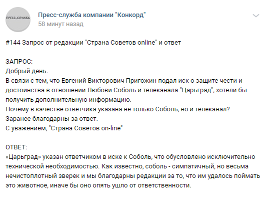 Пресс-служба компании «Конкорд» петербургского предпринимателя Евгения Пригожина прокомментировала подачу иска о защите чести и достоинства к юристу ФБК (НКО -иноагент) Любови Соболь и к телеканалу «Царьград».