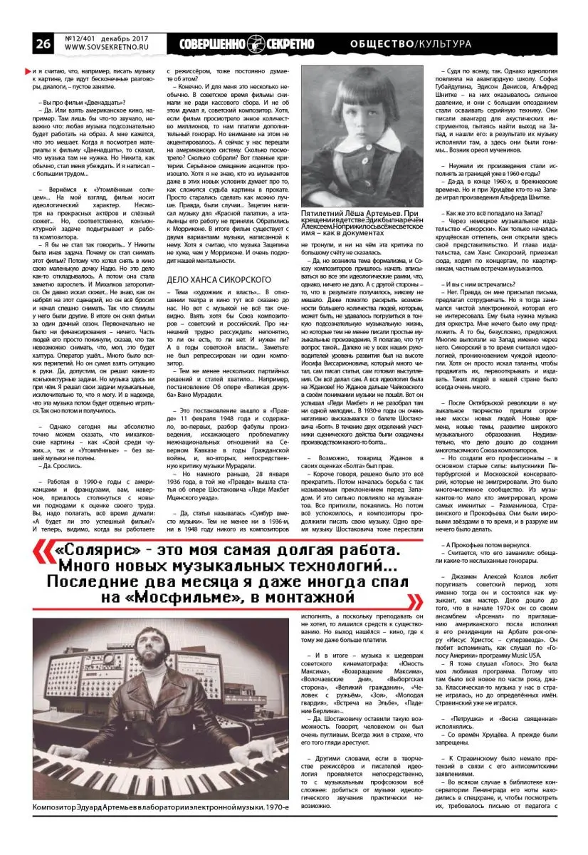 Эдуард Артемьев – отец-основатель отечественной электронной музыки и один из крупнейших композиторов современности. Ещё в начале 60-х годов прошлого столетия загорелась его яркая звезда в прекрасном созвездии таких гигантских светил, как Альфред Шнитке, Эдисон Денисов, София Губайдулина. И вот итог: авангард стал классикой, а терабайты голосов Вселенной материализовались в великих и прекрасных композициях, знакомых всем и каждому.30 ноября Эдуард Николаевич отметил 80-летний юбилей. Отметил, как всегда, тихо, в кругу великих друзей и знаменитых коллег, обязанных своими успехами гениальности композитора. Ещё бы: без тонких тем и мощных образов, рождённых музыкальным гением Артемьева, сегодня просто невозможно представить историю отечественного кинематографа последних лет 50. «Солярис», «Свой среди чужих, чужой среди своих», «Зеркало», «Сибириада», «Раба любви», «Неоконченная пьеса для механического пианино», «ТАСС уполномочен заявить», «Курьер», «Урга: Территории любви», «Сибирский цирюльник», «Утомлённые солнцем». О многих из этих фильмов мы вспоминаем, едва услышав музыку, ставшую классикой порой раньше, чем сами фильмы… Это интервью составлено из нескольких моих бесед с великим композитором.