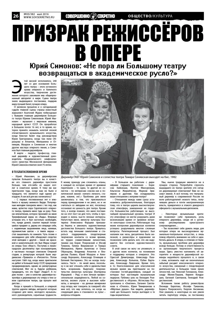 О великом прошлом и о сегодняшней судьбе главной сцены страны известный журналист Анатолий Журин побеседовал с бывшим главным дирижёром Большого театра Юрием Симоновым. Юрий Иванович – музыкант с мировым именем, народный артист СССР. Он проработал в Большом почти 16 лет, в то время, которое принято называть золотой эпохой отечественного музыкального искусства, когда блистал балет под руководством Юрия Григоровича, когда там пели Образцова и Атлантов, Милашкина и Огнивцев, Мазурок и Синявская и многие другие мастера оперного пения, а Симонов был главным дирижёром.