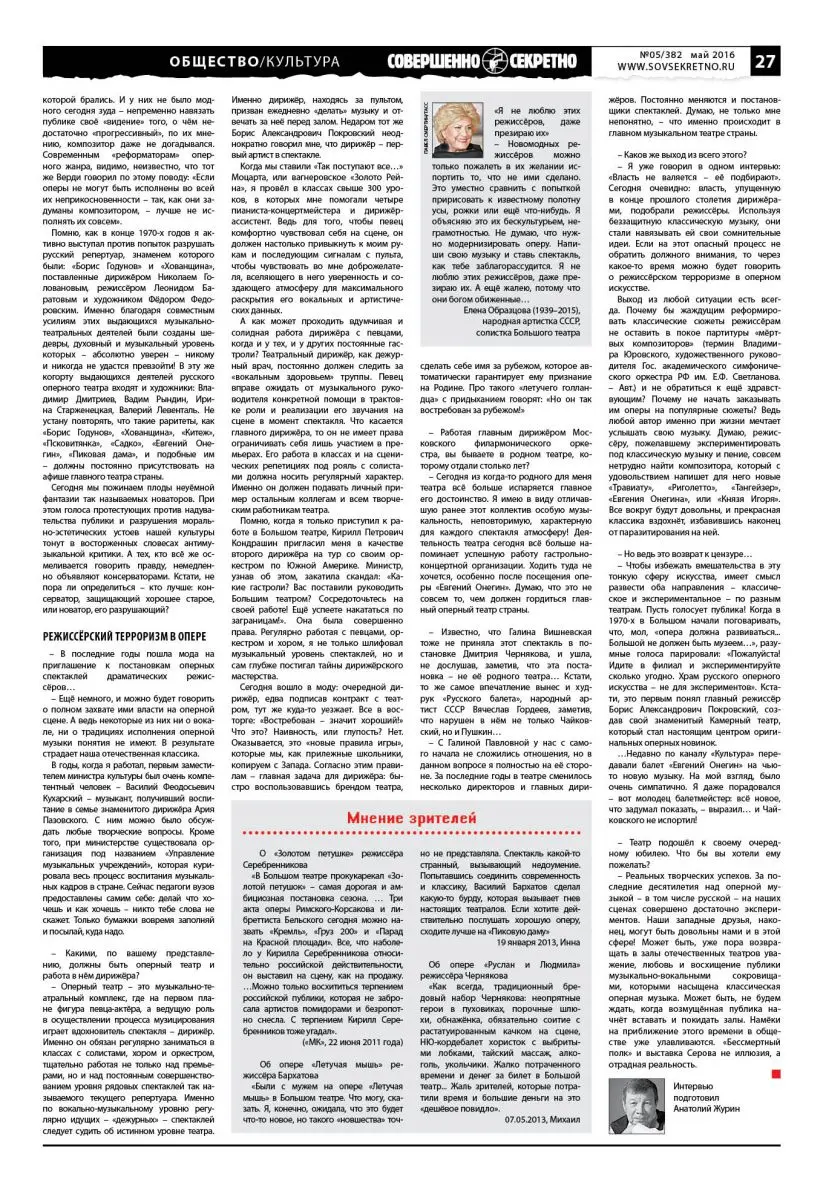 – Реальных творческих успехов. За последние десятилетия над оперной музыкой – в том числе русской – на наших сценах совершено достаточно экспериментов. Наши западные друзья, наконец, могут быть довольны нами и в этой сфере! Может быть, уже пора возвращать в залы отечественных театров уважение, любовь и восхищение публики музыкально-вокальными сокровищами, которыми насыщена классическая оперная музыка. Может быть, не будем ждать, когда возмущённая публика начнёт вставать и покидать залы. Намёки на приближение этого времени в обществе уже улавливаются. «Бессмертный полк» и выставка Серова не иллюзия, а отрадная реальность.