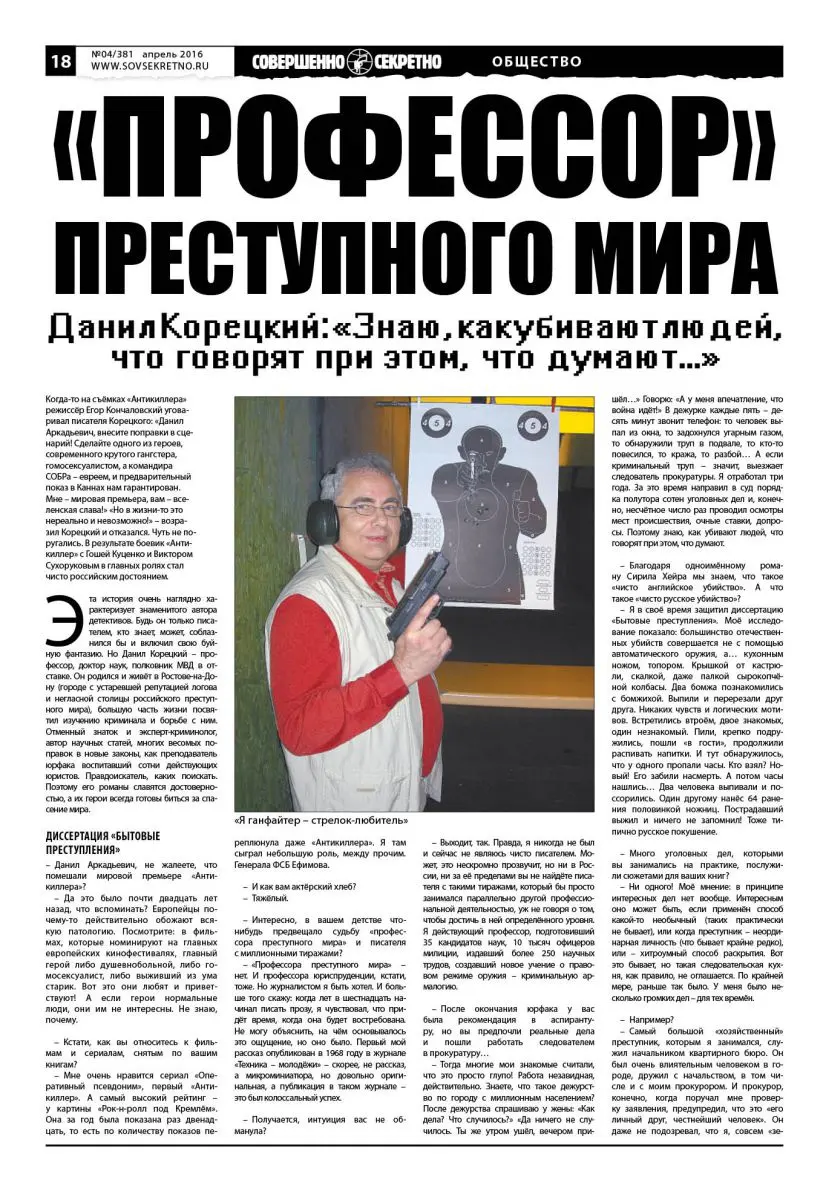 Эта история очень наглядно характеризует знаменитого автора детективов. Будь он только писателем, кто знает, может, соблазнился бы и включил свою буйную фантазию. Но Данил Корецкий – профессор, доктор наук, полковник МВД в отставке. Он родился и живёт в Ростове-на-Дону (городе с устаревшей репутацией логова и негласной столицы российского преступного мира), большую часть жизни посвятил изучению криминала и борьбе с ним. Отменный знаток и эксперт-криминолог, автор научных статей, многих весомых поправок в новые законы, как преподаватель юрфака воспитавший сотни действующих юристов. Правдоискатель, каких поискать. Поэтому его романы славятся достоверностью, а их герои всегда готовы биться за спасение мира.