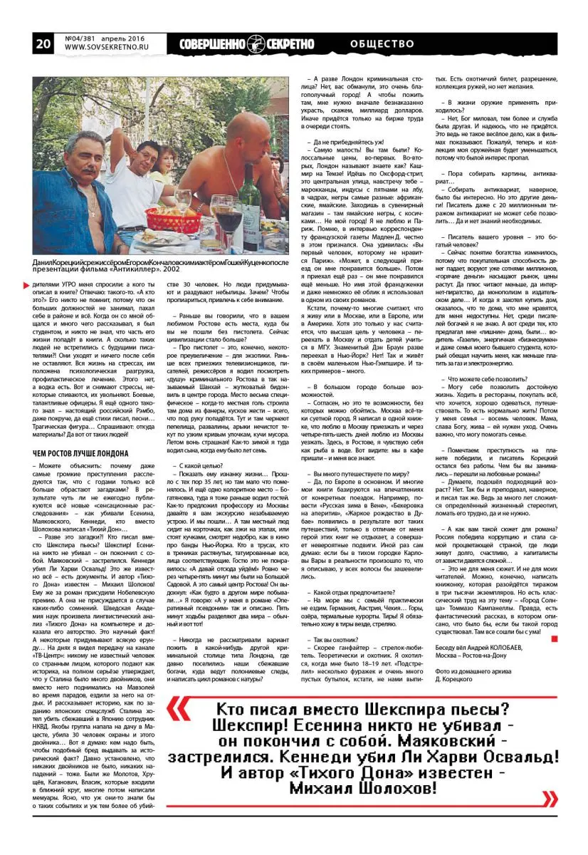 – Разве это загадки?! Кто писал вместо Шекспира пьесы? Шекспир! Есенина никто не убивал – он покончил с собой. Маяковский – застрелился. Кеннеди убил Ли Харви Освальд! Это же известно всё – есть документы. И автор «Тихого Дона» известен – Михаил Шолохов! Ему же за роман присудили Нобелевскую премию. А она не присуждается в случае каких-либо сомнений. Шведская Академия наук произвела лингвистический анализ «Тихого Дона» на компьютере и доказала его авторство. Это научный факт! А некоторые придумывают всякую ерунду… На днях я видел передачу на канале «ТВ-Центр»: никому не известный человек со странным лицом, которого подают как историка, на полном серьёзе утверждает, что у Сталина было много двойников, они вместо него поднимались на Мавзолей во время парадов, ездили за него на отдых. И рассказывает историю, как по заданию японских спецслужб Сталина хотел убить сбежавший в Японию сотрудник НКВД. Якобы группа напала на дачу в Мацесте, убила 30 человек охраны и этого двойника… Вот я думаю: кем надо быть, чтобы подобный бред выдавать за исторический факт? Давно установлено, что никаких двойников не было, никаких нападений – тоже. Были же Молотов, Хрущёв, Каганович, Власик, которые входили в ближний круг, многие потом написали мемуары. Ясно, что уж они-то знали бы о таких событиях и уж тем более об убийстве 30 человек. Но люди придумывают и раздувают небылицы. Зачем? Чтобы пропиариться, привлечь к себе внимание.