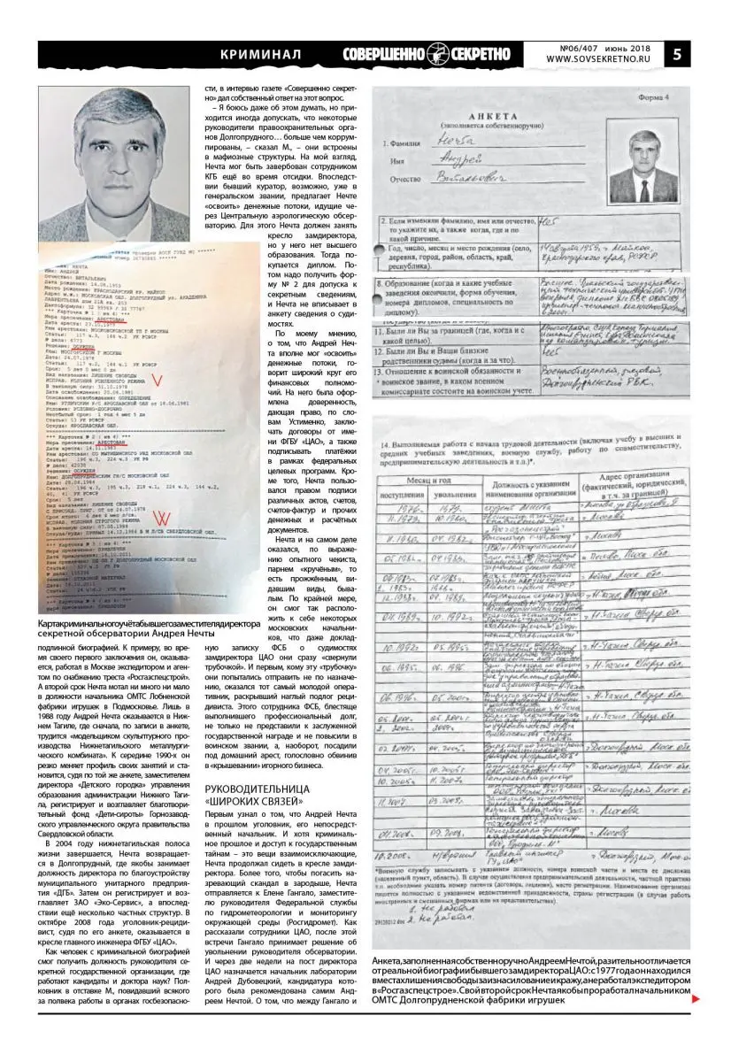 Первым узнал о том, что Андрей Нечта в прошлом уголовник, его непосредственный начальник. И хотя криминальное прошлое и доступ к государственным тайнам – это вещи взаимоисключающие, Нечта продолжал сидеть в кресле замдиректора. Более того, чтобы погасить назревающий скандал в зародыше, Нечта отправляется к Елене Гангало, заместителю руководителя Федеральной службы по гидрометеорологии и мониторингу окружающей среды (Росгидромет). Как рассказали сотрудники ЦАО, после этой встречи Гангало принимает решение об увольнении руководителя обсерватории. И через две недели на пост директора ЦАО назначается начальник лаборатории Андрей Дубовецкий, кандидатура которого была рекомендована самим Андреем Нечтой. О том, что между Гангало и Нечтой установились неформальные отношения, давно судачили в коридорах обсерватории, но с назначением Дубовецкого слухи стали подтверждаться.