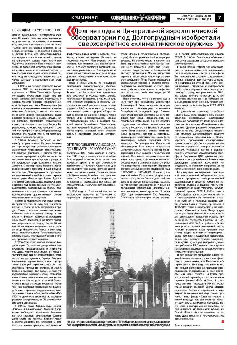 Тогда же, в декабрьские дни 2016-го, в подмосковном городе Долгопрудном уволили директора Центральной аэрологической обсерватории (ЦАО) Андрея Дубовецкого. Ушли и все его замы: по общим вопросам – Андрей Нечта и по финансам – Наталья Журавлёва. Такого «дружного» увольнения начальников обсерватория не знала с момента своего создания в 1941-м. Последние полвека с лишним ЦАО работала на оборону, считалась секретной, а её сотрудники обязаны были иметь официальный допуск к секретным сведениям. Военные эксперты, на условиях анонимности, утверждают, что научные сотрудники ЦАО, среди которых немало докторов и кандидатов наук, долгое время изобретали сверхсекретное «климатическое оружие». И названия отделов Центральной аэрологической обсерватории звучат необыкновенно романтично и загадочно: «физики высоких слоёв атмосферы», «экспериментально-воздухоплавательный», «физики облаков активных воздействий» и «озонного мониторинга».