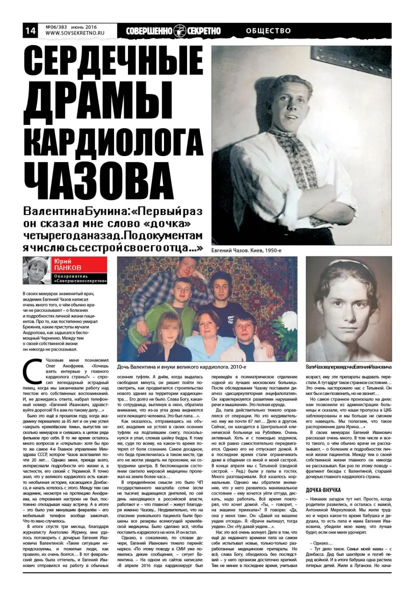 Однако, к сожалению, по словам дочери, Евгений Иванович тяжело перенёс наркоз. «По этому поводу в СМИ уже появились дикие сообщения, – сетует Валентина. – На одном из сайтов написали: «В апреле 2016 года кардиохирург был переведён в психиатрическое отделение «одной из лучших московских больниц». После обследования Чазову поставили диагноз «дисциркуляторная энцефалопатия». Он характеризуется развитием нарушений речи и мышления». Это полная ерунда.