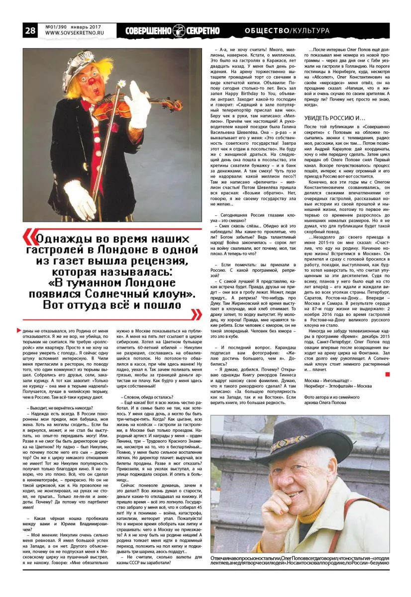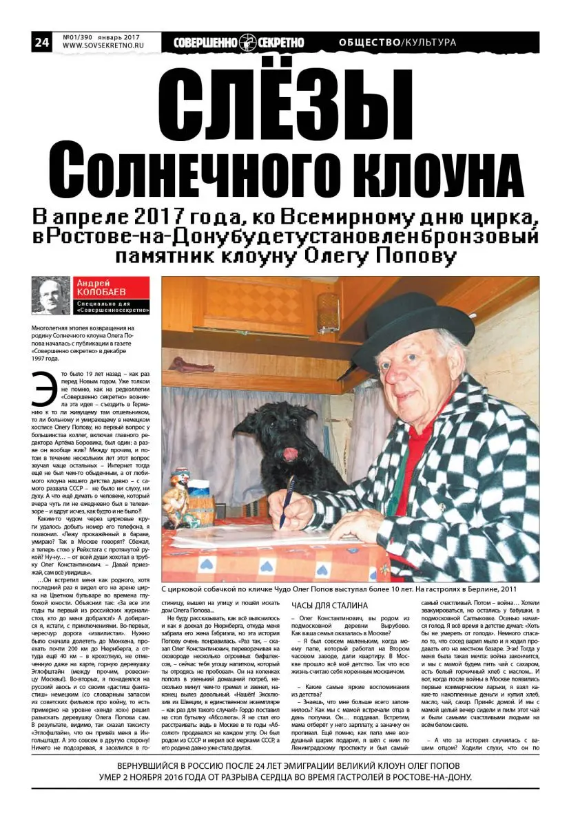 Многолетняя эпопея возвращения на родину Солнечного клоуна Олега Попова началась с публикации в газете «Совершенно секретно» в декабре 1997 года.