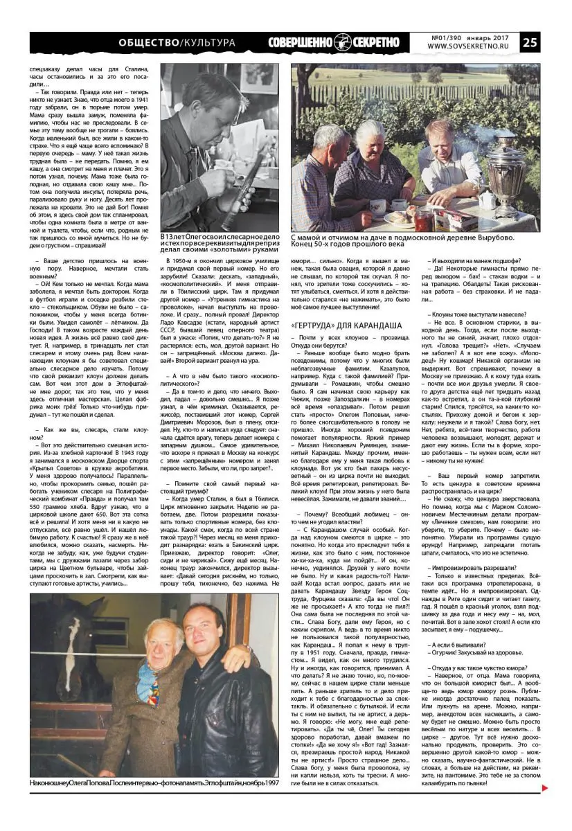 – С Карандашом случай особый. Когда над клоуном смеются в цирке – это понятно. Но когда это преследует тебя в жизни, как это было с ним, постоянное хи-хи-ха-ха, куда ни пойдёт… И он, конечно, уединялся. Друзей у него почти не было. Ну и какая радость-то?! Наливай! Когда встал вопрос, давать или не давать Карандашу Звезду Героя Соцтруда, Фурцева сказала: «Да вы что! Он же не просыхает!» А кто тогда не пил?! Она сама была не последняя по этой части… Слава Богу, дали ему Героя, но с каким скрипом. А ведь в то время никто не пользовался такой популярностью, как Карандаш… Я попал к нему в труппу в 1951 году. Сначала, правда, гимнастом… Я видел, как он много трудился. Ну и иногда, как говорится, принимал. А что делать? Я не знаю точно, но, по-моему, сейчас в нашем цирке стали меньше пить. А раньше зритель то и дело приходит к тебе с благодарностью за спектакль. И обязательно с бутылкой. И если ты с ним не выпил, ты не артист, а дерьмо. Я говорю: «Не могу, мне ещё репетировать». «Да ты чё, Олег! Ты сегодня здорово поработал, давай вмажем по стопке!» «Да не хочу я!» «Вот гад! Зазнался, презираешь простой народ. Никакой ты не артист!» Просто страшное дело… Слава богу, у меня была проволока, ну ни капли нельзя, хоть ты тресни. А многие были не в силах отказаться.