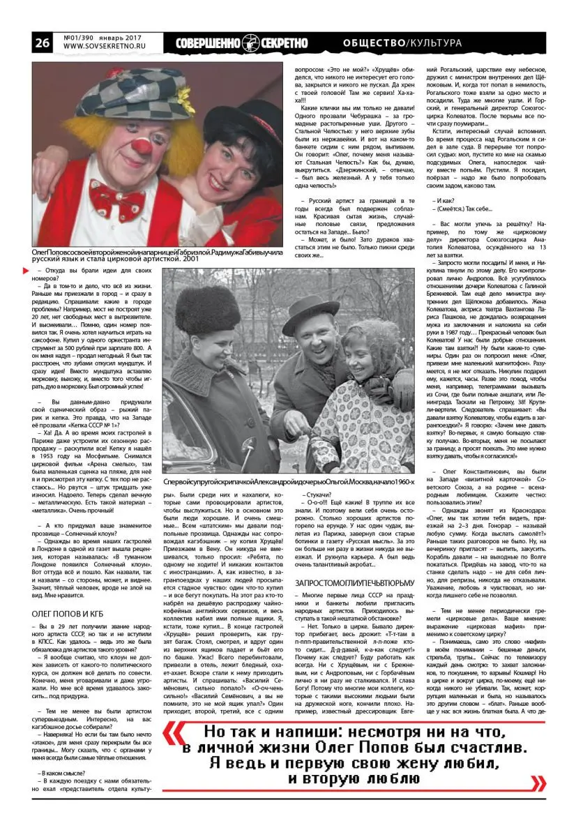 Но так и напиши: несмотря ни на что, в личной жизни Олег Попов был счастлив. Я ведь и первую свою жену любил, и вторую люблю. Александра ещё во времена СССР умерла от рака. Год, по русскому обычаю, я был в трауре. Потом вот Габриэль, как говорится, Бог дал. На эту тему есть анекдот. Тонет мужик в реке. Проезжает мимо лодка, с неё кричат: залезай, мол. Мужик отвечает: «Нет. Меня Бог спасёт». Через какое-то время вторая лодка, опять кричат: «Ты же утонешь!» Тот стоит на своём: «Меня Бог спасёт». Потом третья лодка. Мужик и на этот раз отказался. И утонул. Попадает к Богу. «Как же так, я тебя просил, а ты не спас!» Бог ему отвечает: «Это же я тебе три лодки посылал». И вот когда я встретил Габриель, подумал: может, Габи и есть та самая «лодка».
