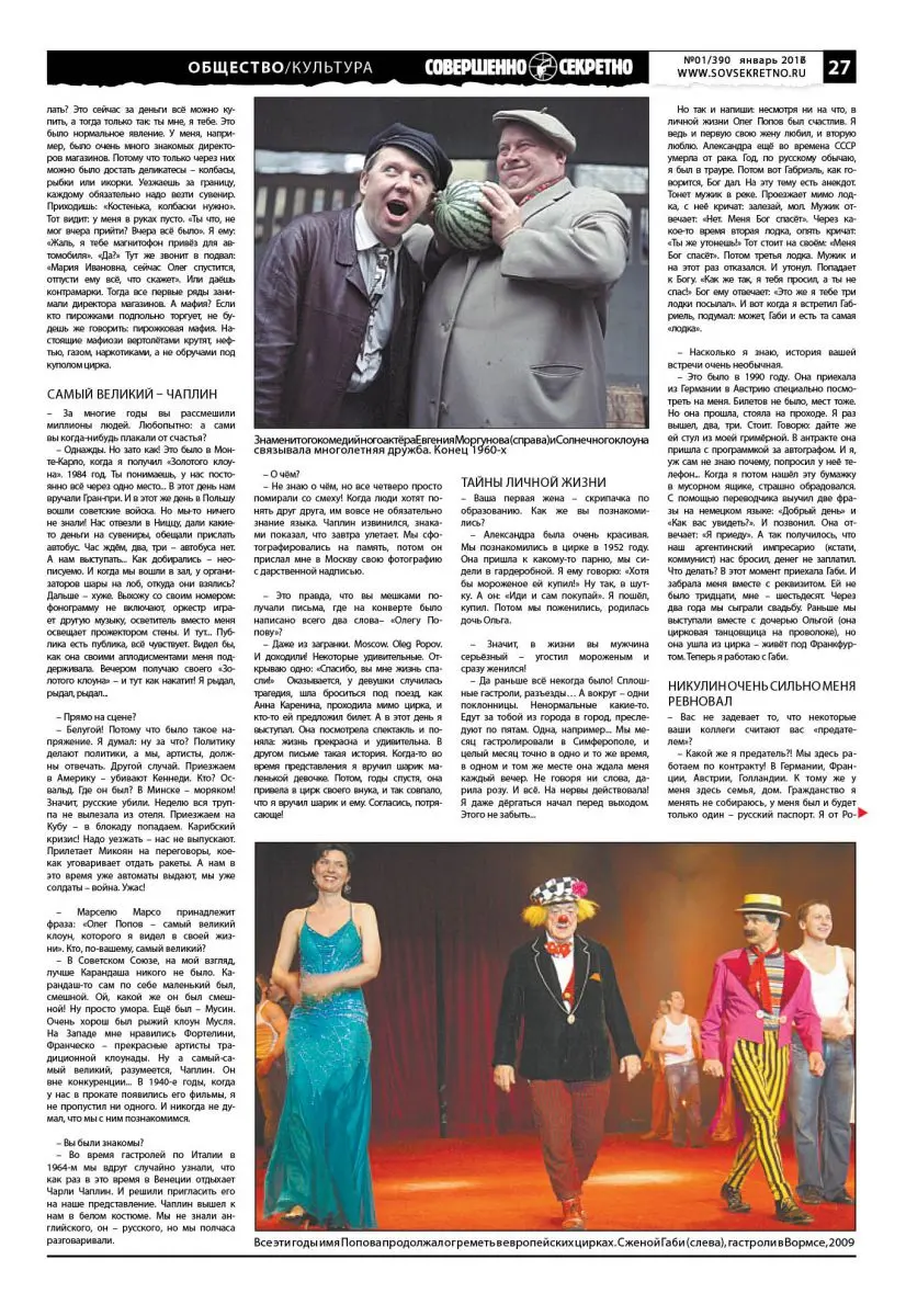 – Это было в 1990 году. Она приехала из Германии в Австрию специально посмотреть на меня. Билетов не было, мест тоже. Но она прошла, стояла на проходе. Я раз вышел, два, три. Стоит. Говорю: дайте же ей стул из моей гримёрной. В антракте она пришла с программкой за автографом. И я, уж сам не знаю почему, попросил у неё телефон… Когда я потом нашёл эту бумажку в мусорном ящике, страшно обрадовался. С помощью переводчика выучил две фразы на немецком языке: «Добрый день» и «Как вас увидеть?». И позвонил. Она отвечает: «Я приеду». А так получилось, что наш аргентинский импресарио (кстати, коммунист) нас бросил, денег не заплатил. Что делать? В этот момент приехала Габи. И забрала меня вместе с реквизитом. Ей не было тридцати, мне – шестьдесят. Через два года мы сыграли свадьбу. Раньше мы выступали вместе с дочерью Ольгой (она цирковая танцовщица на проволоке), но она ушла из цирка – живёт под Франкфуртом. Теперь я работаю с Габи.