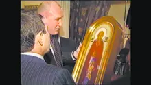 | Пятидесятилетие питерского «авторитета» Владимира Кумарина. Заместитель председателя законодательного собрания Тамбовской области Андрей Попов вручает юбиляру икону. До сурового приговора Кумарину остаётся совсем немного | |