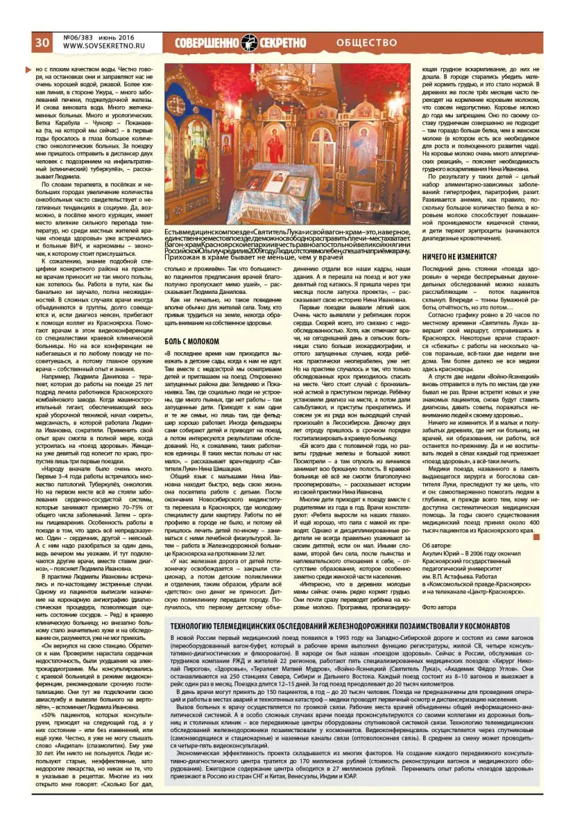Железнодорожной медицине в России уже больше 172 лет. В новой России работают пять специализированных медицинских поездов: «Хирург Николай Пирогов», «Здоровье», «Терапевт Матвей Мудров», «Войно-Ясенецкий (Святитель Лука)», «Академик Фёдор Углов», которые обслуживают жителей 22 регионов. Они останавливаются на 250 станциях Севера, Сибири и Дальнего Востока. Корреспондент «Совершенно секретно» побывал в командировке вместе с врачами поезда «Войно-Ясенецкий (Святитель Лука)», которые на этот раз отправились на станцию Решоты, что на границе Красноярского края и Иркутской области.