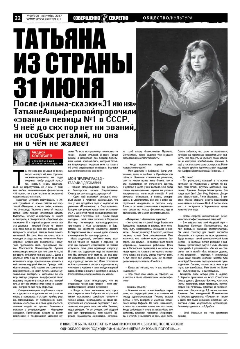 Известная история: поругавшись с Аллой Пугачёвой во время работы над картиной «Женщина, которая поёт», композитор Александр Зацепин в пику ей задался целью найти певицу, «способную затмить Пугачёву». Татьяну Анциферову он нашёл в Ужгороде, в Закарпатской областной филармонии. И с первой встречи понял: вот эта девушка – сможет! После «31 июня» она пела песни во всех его фильмах. Популярность молодой певицы была ошеломительной. Её голос был настолько нов и свеж для эстрады тех лет, что именно Анциферовой Александра Николаевна Пахмутова предложила спеть прощальную песню Московской Олимпиады-80. Лучшие композиторы писали для неё свои хиты, её концерты собирали полные залы… Даже в смутные 1990-е на её горизонте то и дело появлялись люди, предлагавшие вложить в неё миллион-другой баксов. Правда, либо бритоголовые, либо совсем уж сомнительной репутации, но факт! Кстати, многие музыкальные эксперты и меломаны до сих пор твёрдо уверены: Анциферовой было под силу переплюнуть всех и стать певицей №1. А вот «не смогла» или «сама не захотела» – вопрос по сию пору открытый.