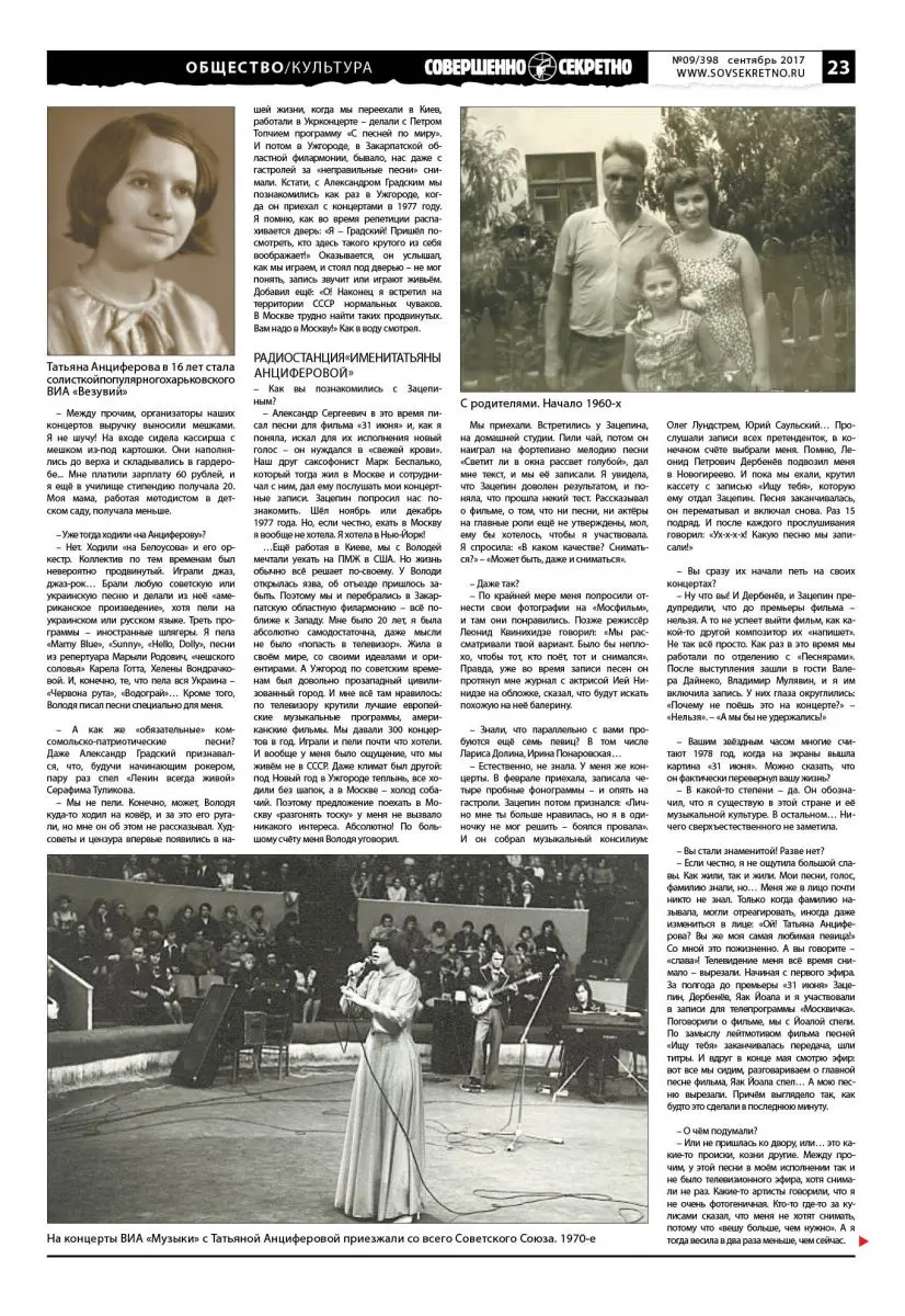 – Если честно, я не ощутила большой славы. Как жили, так и жили. Мои песни, голос, фамилию знали, но… Меня же в лицо почти никто не знал. Только когда фамилию называла, могли отреагировать, иногда даже измениться в лице: «Ой! Татьяна Анциферова? Вы же моя самая любимая певица!» Со мной это пожизненно. А вы говорите – «слава»! Телевидение меня всё время снимало – вырезали. Начиная с первого эфира. За полгода до премьеры «31 июня» Зацепин, Дербенёв, Яак Йоала и я участвовали в записи для телепрограммы «Москвичка». Поговорили о фильме, мы с Йоалой спели. По замыслу лейтмотивом фильма песней «Ищу тебя» заканчивалась передача, шли титры. И вдруг в конце мая смотрю эфир: вот все мы сидим, разговариваем о главной песне фильма, Яак Йоала спел… А мою песню вырезали. Причём выглядело так, как будто это сделали в последнюю минуту
