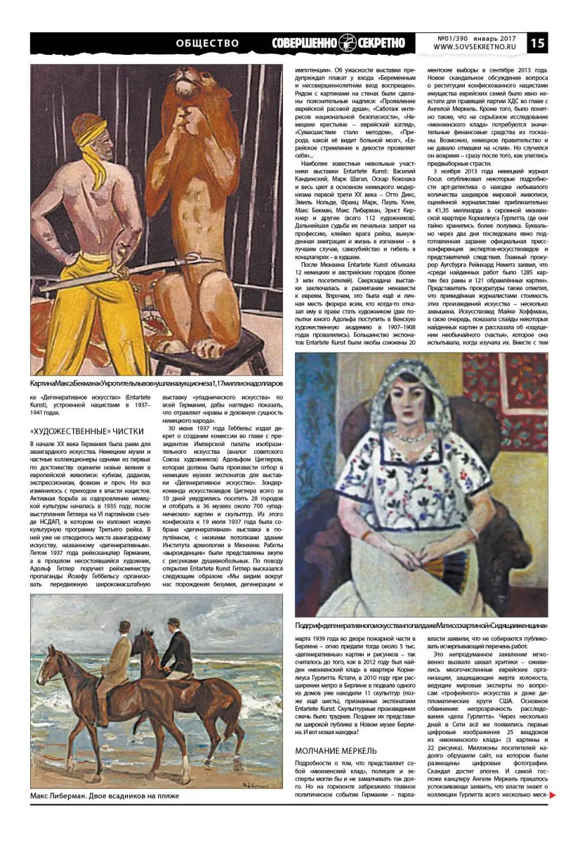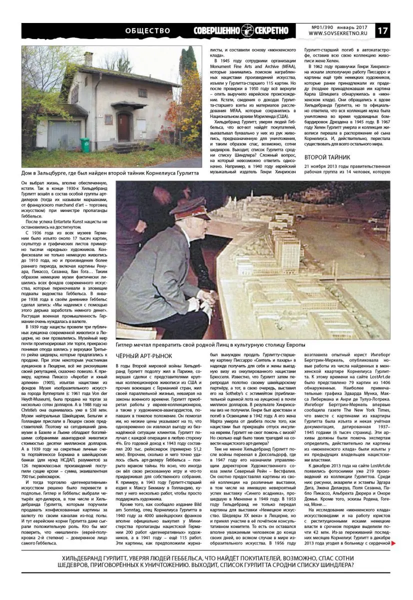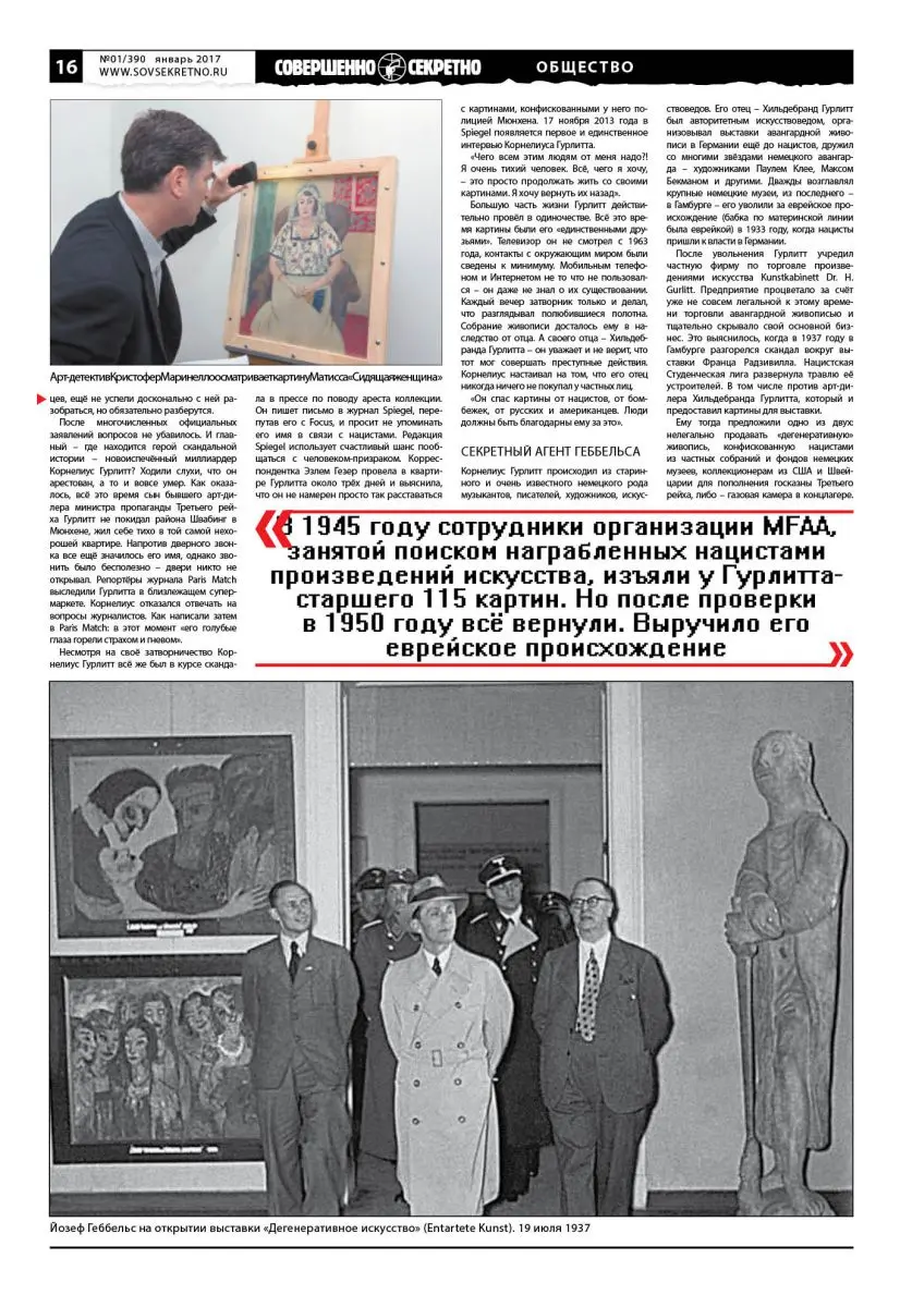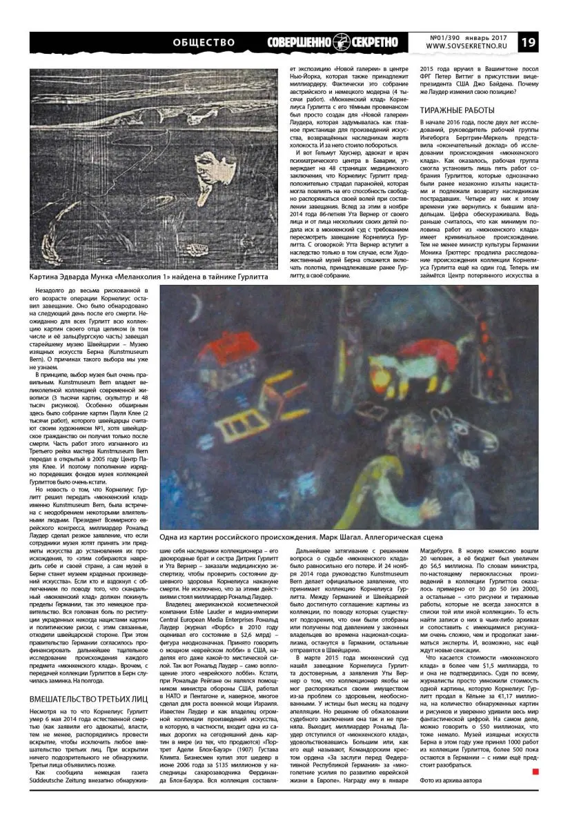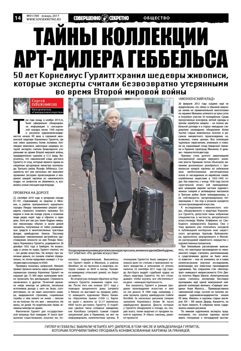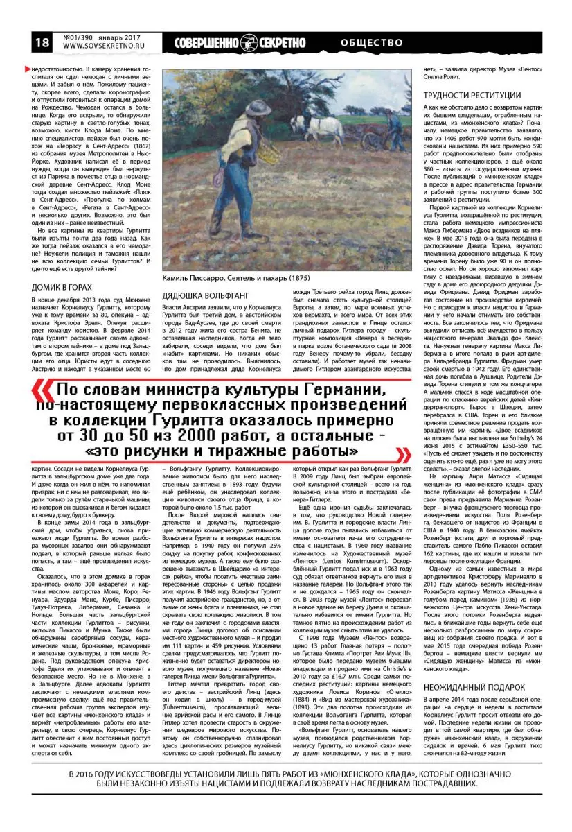 Три года назад, в ноябре 2013-го, была официально обнародована информация о сенсационной находке около 1500 картин и рисунков художников-модернистов начала XX века в скромной мюнхенской квартире Корнелиуса Гурлитта, где они тайно хранились более полувека. Коллекцию живописи, некоторые шедевры которой эксперты считали безвозвратно утерянными во время Второй мировой войны, предварительно оценили в $1,5 млрд. Выяснилось, что «мюнхенский клад» достался Гурлитту от отца, который являлся одним из секретных арт-дилеров министра пропаганды Третьего рейха Йозефа Геббельса. Специалисты вот уже несколько лет выясняют провенанс (историю происхождения и владения) каждой картины из «мюнхенского клада», но вопросов не убавляется, и, возможно, новые сенсации ещё впереди.