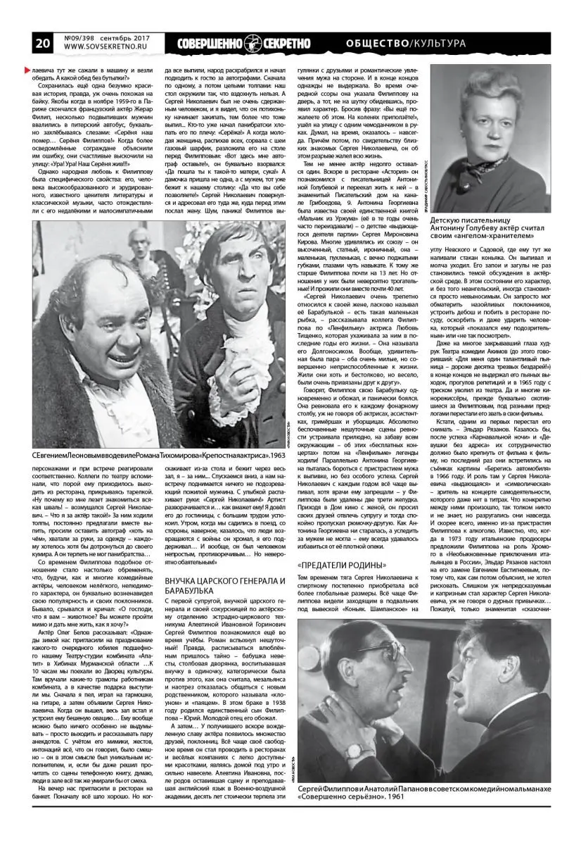 Тем не менее актёр недолго оставался один. Вскоре в ресторане «Астория» он познакомился с писательницей Антониной Голубевой и переехал жить к ней – в знаменитый Писательский дом на канале Грибоедова, 9. Антонина Георгиевна была известна своей единственной книгой «Мальчик из Уржума» (её в те годы очень часто переиздавали) – о детстве «выдающегося деятеля партии» Сергея Мироновича Кирова. Многие удивлялись их союзу – он высоченный, статный, ироничный, она – маленькая, пухленькая, с вечно поджатыми губками, глазами чуть навыкате. К тому же старше Филиппова почти на 13 лет. Но отношения у них были невероятно трогательные! И прожили они вместе почти 40 лет.