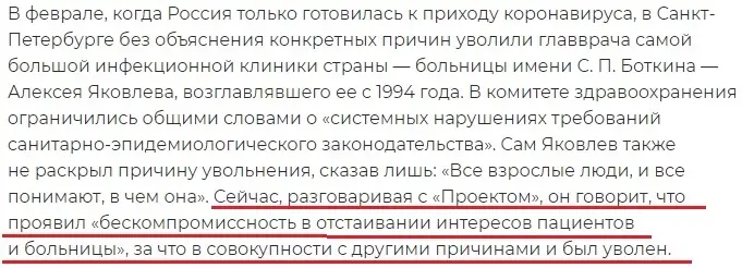 Кроме того, автор материала напомнил о недавнем увольнении главврача больницы имени С.П Боткина Алексея Яковлева, который возглавлял медучреждение с 1994 года. Редакция уверена, что Яковлев был высококвалифицированным специалистом, а в его увольнении наблюдаются «политические мотивы». При этом сам бывший главврач до сих пор не озвучил настоящую причину увольнения.