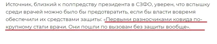 В публикации журналисты издания указали на то, что основными разносчиками коронавируса в петербургских больницах якобы стали врачи, которых не обеспечили вовремя необходимыми средствами индивидуальной защиты.
