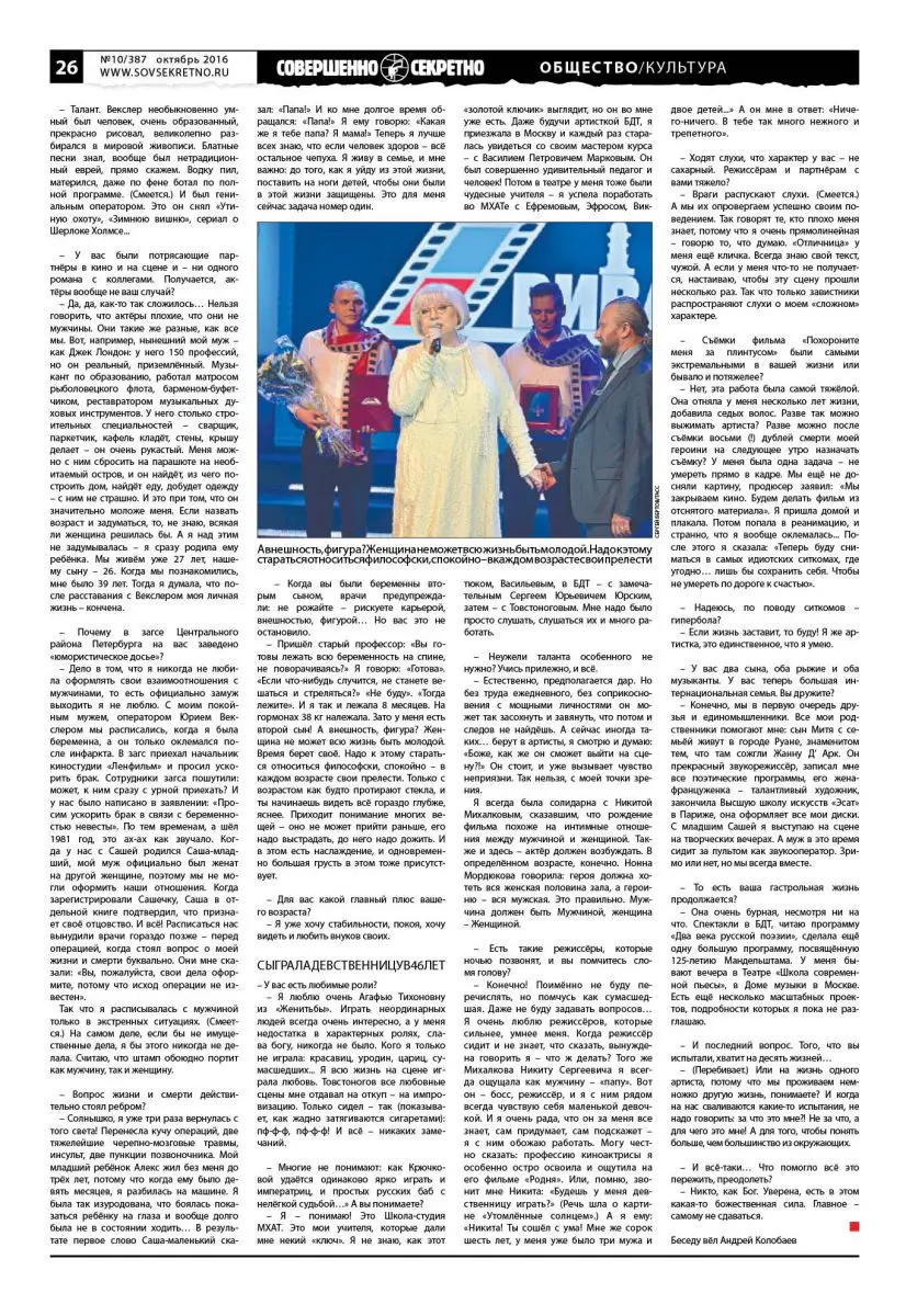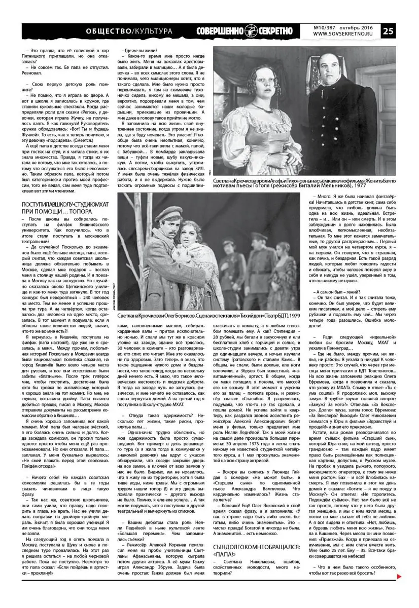 …Когда журналист «Совершенно секретно» Андрей Колобаев позвонил накануне открытия нового театрального сезона, Светлана Николаевна комментировать болезнь и своё самочувствие отказалась наотрез. «О чём вы спрашиваете? У меня «Васса Железнова», «Игрок» по Достоевскому – на сцене БДТ. Репетиции, поэтические вечера, поездки, гастроли, планы… До Нового года в рабочем графике нет секунды свободной. Когда мне болеть?!»