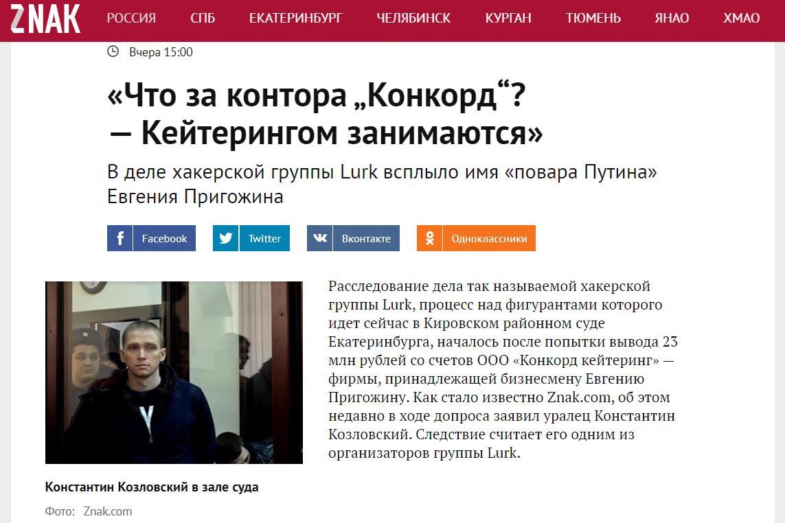 «Совершенно секретно»: Издание Znak.com опубликовало «расследование» о хакерской группировке Lurk, которая якобы украла 23 миллиона рублей со счетов компании «Конкорд Кейтеринг» бизнесмена Евгения Пригожина в 2016 году. Вся работа журналистов рассыпается о два простых факта: пресс-служба компании отрицает факт кражи, а сам «Конкорд Кейтеринг» появился только в 2018 году.