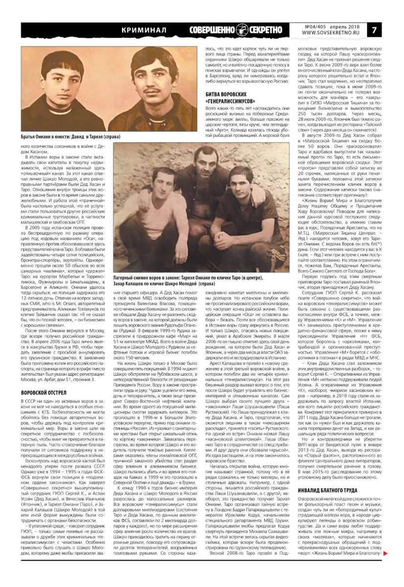– Клан Деда Хасана стал заложником этих внутриведомственных разборок, – говорит Сергей К. – Оперативники из Управления «М» негласно поддерживали людей Усояна. А оперативники из Управления «К», наоборот, чморили хасановских воров – например, в 2010 году стали их задерживать по запросу властей Испании, кое-кого лишили российского гражданства. Конфликт этот прекратился примерно в 2011 году, Деда Хасана больше не трогали, так как он нужен был и как держатель канала переправки денег на Запад, и как решальщик ряда политических вопросов.