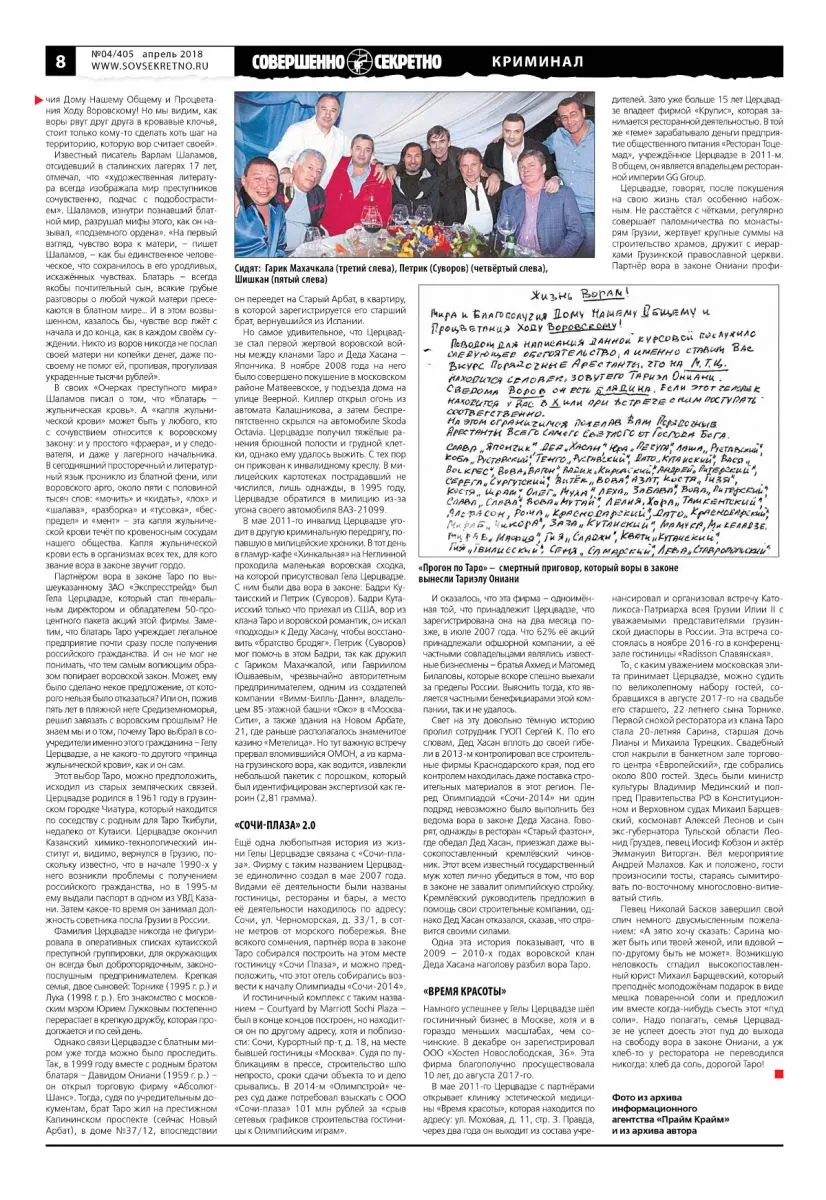 Свет на эту довольно тёмную историю пролил сотрудник ГУОП Сергей К. По его словам, Дед Хасан вплоть до своей гибели в 2013-м контролировал все строительные фирмы Краснодарского края, под его контролем находилась даже поставка строительных материалов в этот регион. Перед Олимпиадой «Сочи-2014» ни один подряд невозможно было выполнить без ведома вора в законе Деда Хасана. Говорят, однажды в ресторан «Старый фаэтон», где обедал Дед Хасан, приезжал даже высокопоставленный кремлёвский чиновник. Этот всем известный государственный муж хотел лично убедиться в том, что вор в законе не завалит олимпийскую стройку. Кремлёвский руководитель предложил в помощь свои строительные компании, однако Дед Хасан отказался, сказав, что справится своими силами.