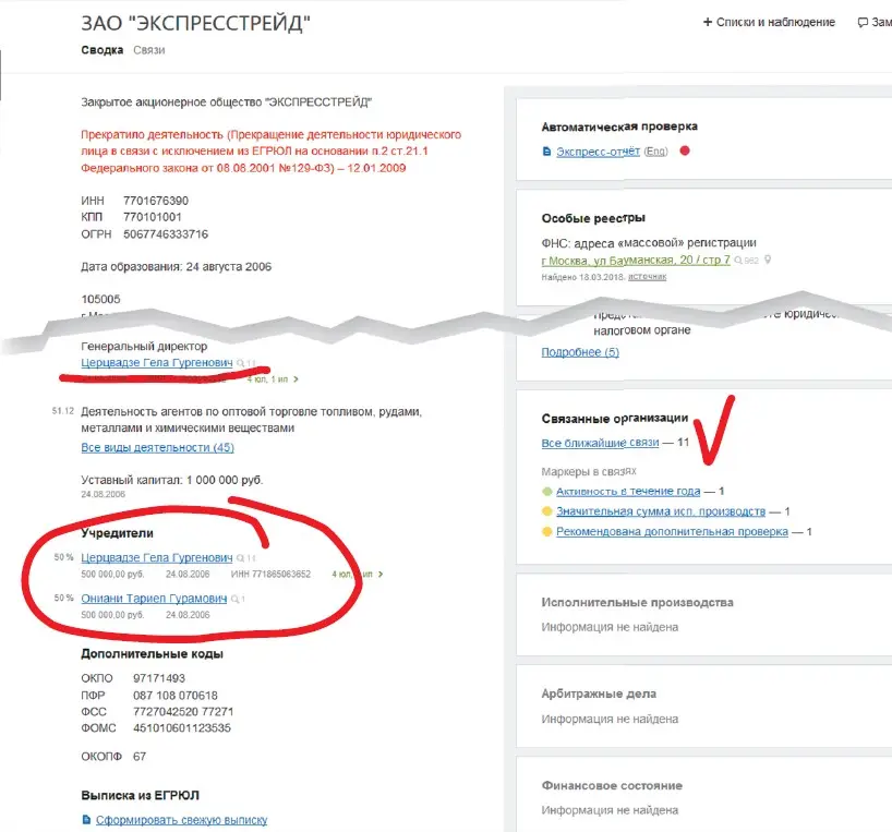 Хотя рано ещё Таро строчить «малявы» с победными реляциями, надо признать, что этот вор в законе готов к свободе больше, чем все его коллеги по криминальному бизнесу. Таро первым провозгласил равноправие «подземного ордена» воров и цивильного мира наживы, официально зарегистрировав в Министерстве юстиции свою коммерческую фирму – ЗАО «Экспресстрейд». Согласно базе данных «Контур.Фокус», произошло это в августе 2006 года, фирма создавалась, как сказано в учредительных документах, для «оптовой торговли топливом, рудами, металлами и химическими веществами», её уставный капитал – 1 миллион рублей. Таро, надо признать, постарался соблюсти остатки воровского кодекса, категорически отказавшись принять идентификационный номер налогоплательщика (ИНН), – так в документах и осталась незаполненной графа, где должен быть указан этот цифровой код.