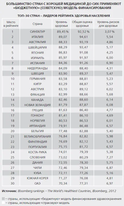 Несложно заметить, большинство развитых стран с хорошей медициной применяют бюджетную модель её финансирования. Мы же от этой модели отреклись, погнавшись за химерой «свободного мира». Но обратим внимание, что в ТОП-30 даже близко не вошли Соединённые Штаты Америки.